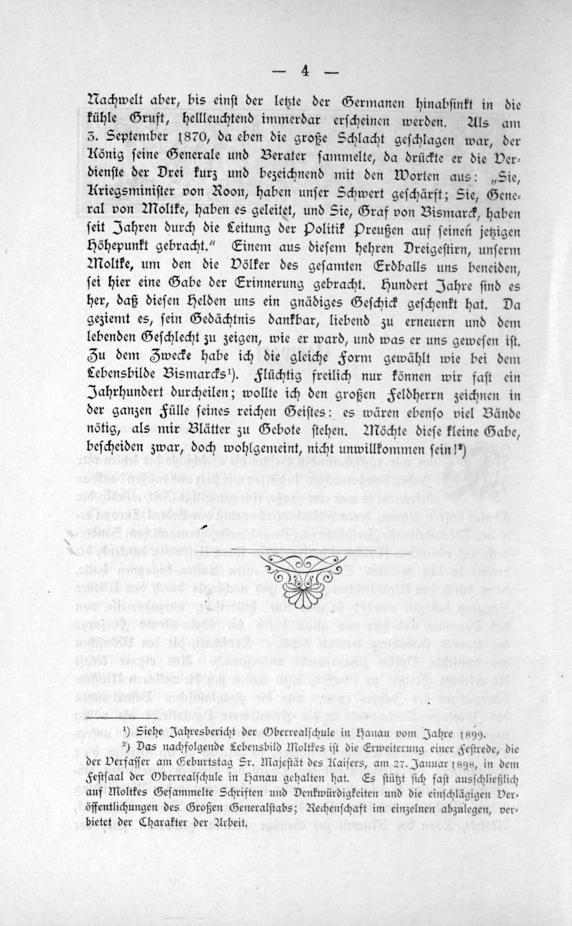 ²) Das nachfolgende Lebensbild Moltkes iſt die Erweiterung einer Feſtrede, die der Verfaſſer am Geburtstag Sr. Majeſtät des Kaiſers, am 22. Januar 1898, in dem Feſtſaal der Oberrealſchule in Hanau gehalten hat. Es ſtützt ſich faſt ausſchließlich auf Moltkes Geſammelte Schriften und Denkwürdigkeiten und die einſchlägigen Ver⸗ öffentlichungen des Großen Generalſtabs; Rechenſchaft im einzelnen abzulegen, ver⸗ bietet der Charakter der Arbeit.