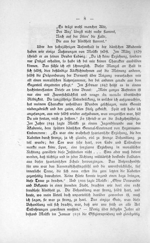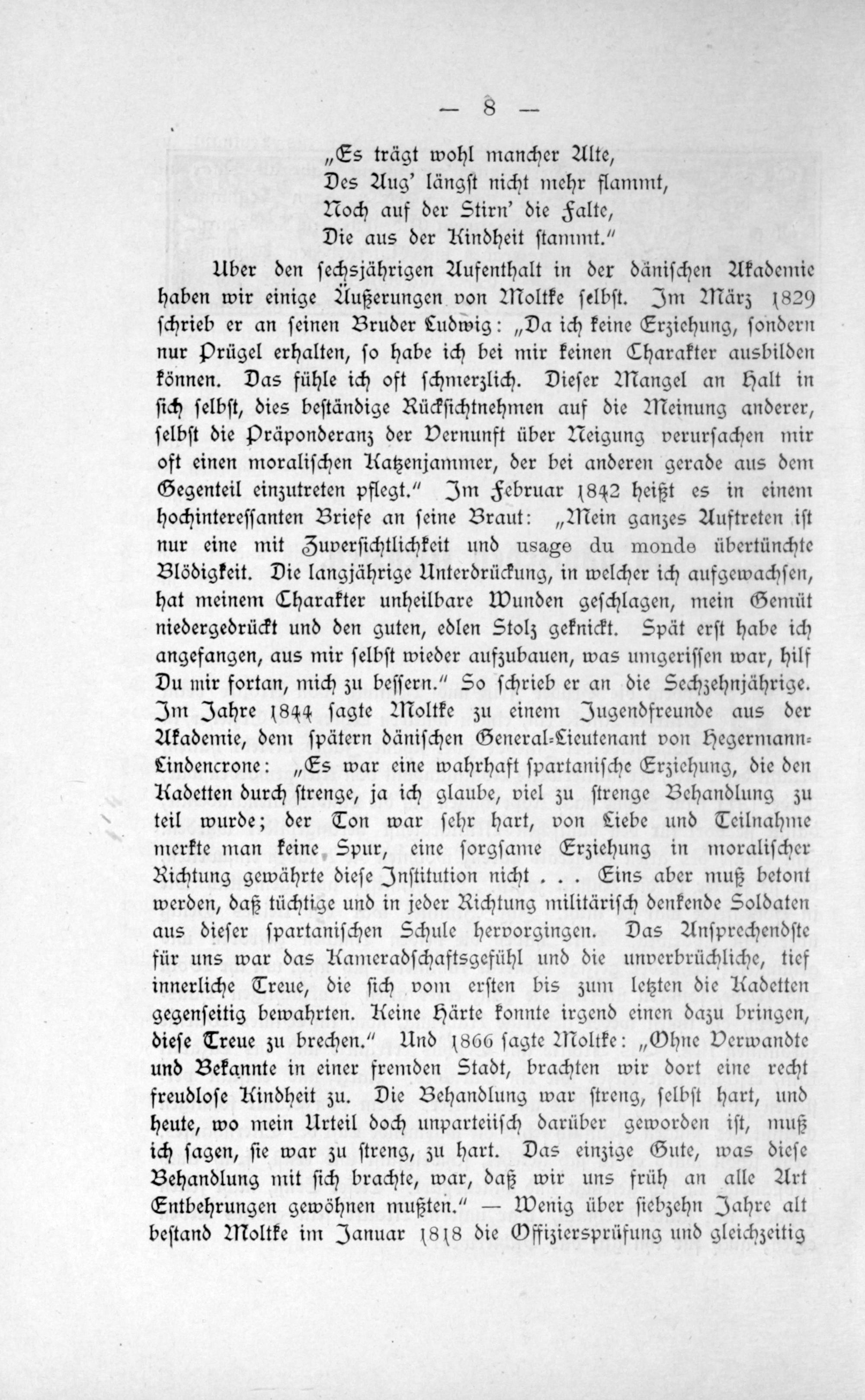 Uber den ſechsjährigen Aufenthalt in der däniſchen Akademie haben wir einige Außerungen von Moltke ſelbſt. Im März 1829 ſchrieb er an ſeinen Bruder Ludwig:„Da ich keine Erziehung, ſondern nur Prügel erhalten, ſo habe ich bei mir keinen Charakter ausbilden können. Das fühle ich oft ſchmerzlich. Dieſer Mangel an Halt in ſich ſelbſt, dies beſtändige Rückſichtnehmen auf die Meinung anderer, ſelbſt die Präponderanz der Vernunft über Neigung verurſachen mir oft einen moraliſchen Katzenjammer, der bei anderen gerade aus dem Gegenteil einzutreten pflegt.“ Im Februar 1842 heißt es in einem hochintereſſanten Briefe an ſeine Braut:„Mein ganzes Auftreten iſt nur eine mit Zuverſichtlichkeit und usage du monde übertünchte Blödigkeit. Die langjährige Unterdrückung, in welcher ich aufgewachſen, hat meinem Charakter unheilbare Wunden geſchlagen, mein Gemüt niedergedrückt und den guten, edlen Stolz geknickt. Spät erſt habe ich angefangen, aus mir ſelbſt wieder aufzubauen, was umgeriſſen war, hilf Du mir fortan, mich zu beſſern.“ So ſchrieb er an die Sechzehnjährige. Im Jahre 1844 ſagte Moltke zu einem Jugendfreunde aus der Akademie, dem ſpätern däniſchen General⸗Lieutenant von Hegermann⸗ Lindencrone:„Es war eine wahrhaft ſpartaniſche Erziehung, die den Kadetten durch ſtrenge, ja ich glaube, viel zu ſtrenge Behandlung zu teil wurde; der Ton war ſehr hart, von Tiebe und Teilnahme merkte man keine Spur, eine ſorgſame Erziehung in moraliſcher Richtung gewährte dieſe Inſtitution nicht... SEins aber muß betont werden, daß tüchtige und in jeder Richtung militäriſch denkende Soldaten aus dieſer ſpartaniſchen Schule hervorgingen. Das Anſprechendſte für uns war das Kameradſchaftsgefühl und die unverbrüchliche, tief innerliche Treue, die ſich vom erſten bis zum letzten die Uadetten gegenſeitig bewahrten. Keine Härte konnte irgend einen dazu bringen, dieſe Treue zu brechen.“ Und 1866 ſagte Moltke:„Ohne Verwandte und Bekannte in einer fremden Stadt, brachten wir dort eine recht freudloſe Kindheit zu. Die Behandlung war ſtreng, ſelbſt hart, und heute, wo mein Urteil doch unparteiiſch darüber geworden iſt, muß ich ſagen, ſie war zu ſtreng, zu hart. Das einzige Gute, was dieſe Behandlung mit ſich brachte, war, daß wir uns früh an alle Art Entbehrungen gewöhnen mußten.“— Wenig über ſiebzehn Jahre alt beſtand Moltke im Januar 1818 die Offiziersprüfung und gleichzeitig