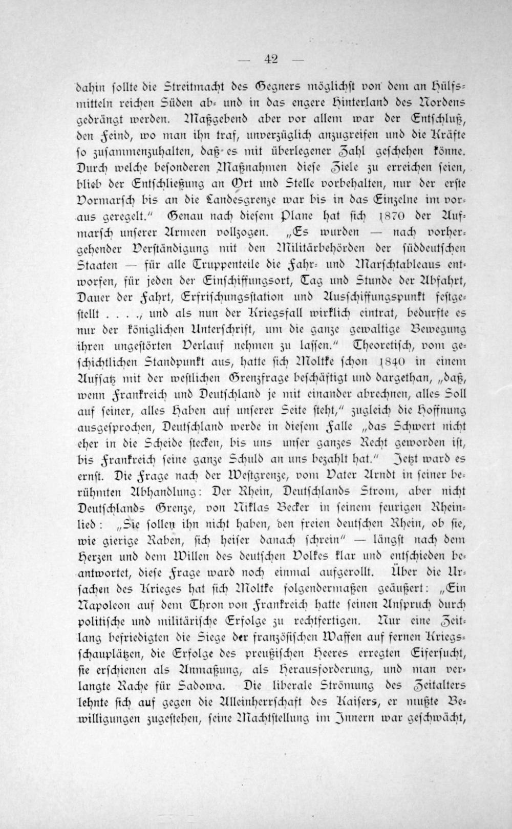 dahin ſollte die Streitmacht des Gegners möglichſt von dem an Hülfs⸗ mitteln reichen Süden ab⸗ und in das engere Hinterland des Nordens gedrängt werden. Maßgebend aber vor allem war der Entſchluß, den Feind, wo man ihn traf, unverzüglich anzugreifen und die Kräfte ſo zuſammenzuhalten, daß es mit überlegener Zahl geſchehen könne. Durch welche beſonderen Maßnahmen dieſe Ziele zu erreichen ſeien, blieb der Entſchließung an Ort und Stelle vorbehalten, nur der erſte Vormarſch bis an die Landesgrenze war bis in das Einzelne im vor⸗ aus geregelt.“ Genau nach dieſem Plane hat ſich 1870 der Auf⸗ marſch unſerer Armeen vollzogen.„Es wurden— nach vorher⸗ gehender Verſtändigung mit den Militärbehörden der ſüddeutſchen Staaten— für alle Truppenteile die Fahr- und Marſchtableaus ent⸗ worfen, für jeden der Einſchiffungsort, Tag und Stunde der Abfahrt, Dauer der Fahrt, Erfriſchungsſtation und Ausſchiffungspunkt feſtge⸗ ſtellt.... und als nun der Kriegsfall wirklich eintrat, bedurfte es nur der königlichen Unterſchrift, um die ganze gewaltige Bewegung ihren ungeſtörten Verlauf nehmen zu laſſen.“ Theoretiſch, vom ge⸗ ſchichtlichen Standpunkt aus, hatte ſich Moltke ſchon 1840 in einem Aufſatz mit der weſtlichen Grenzfrage beſchäftigt und dargethan,„daß, wenn Frankreich und Deutſchland je mit einander abrechnen, alles Soll auf ſeiner, alles Haben auf unſerer Seite ſteht,“ zugleich die Hoffnung ausgeſprochen, Deutſchland werde in dieſem Falle„das Schwert nicht eher in die Scheide ſtecken, bis uns unſer ganzes Recht geworden iſt, bis Frankreich ſeine ganze Schuld an uns bezahlt hat.“ Jetzt ward es ernſt. Die Frage nach der Weſtgrenze, vom Vater Arndt in ſeiner be⸗ rühmten Abhandlung: Der Rhein, Deutſchlands Strom, aber nicht Deutſchlands Grenze, von Miklas Becker in ſeinem feurigen Rhein⸗ lied:„Sie ſollen ihn nicht haben, den freien deutſchen Rhein, ob ſie, wie gierige Raben, ſich heiſer danach ſchrein“— längſt nach dem Herzen und dem Willen des deutſchen Volkes klar und entſchieden be⸗ antwortet, dieſe Frage ward noch einmal aufgerollt. Über die Ur- ſachen des Krieges hat ſich Moltke folgendermaßen geäußert:„ESin Mapoleon auf dem Thron von Frankreich hatte ſeinen Anſpruch durch politiſche und militäriſche Erfolge zu rechtfertigen. Nur eine Zeit⸗ lang befriedigten die Siege der franzöſiſchen Waffen auf fernen Uriegs⸗ ſchauplätzen, die Erfolge des preußiſchen Heeres erregten Eiferſucht, ſie erſchienen als Anmaßung, als Herausforderung, und man ver⸗ langte Rache für Sadowa. Die liberale Strömung des Zeitalters lehnte ſich auf gegen die Alleinherrſchaft des Kaiſers, er mußte Be⸗ willigungen zugeſtehen, ſeine Machtſtellung im Innern war geſchwächt,