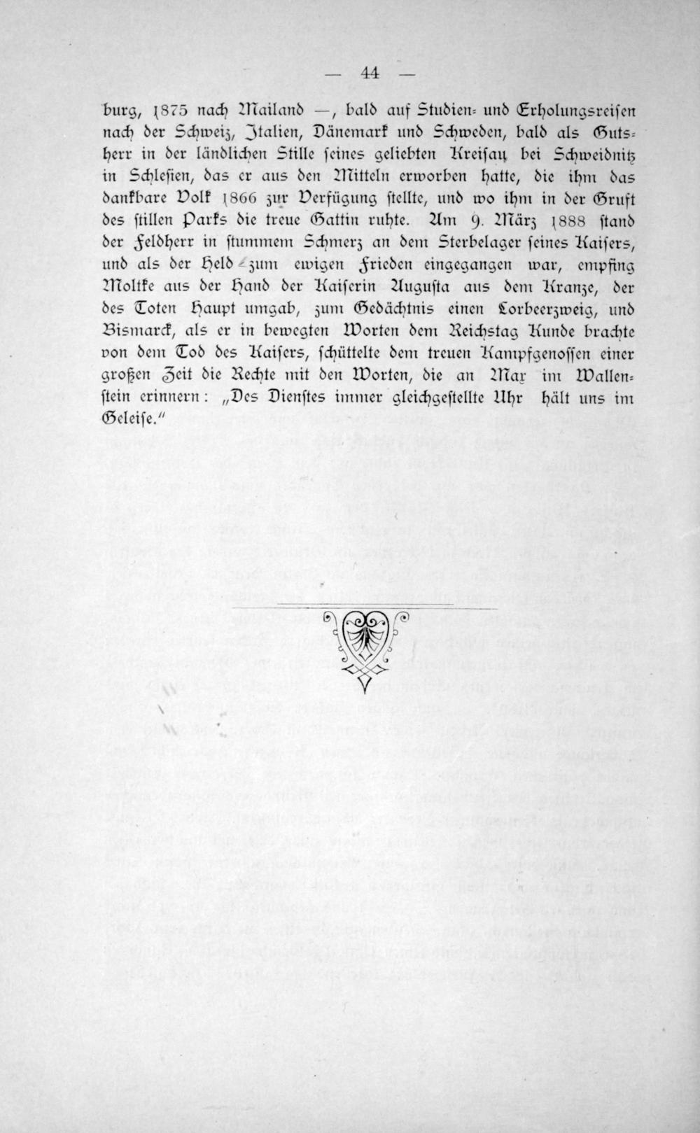 burg, 1875 nach Mailand—, bald auf Studien⸗ und Erholungsreiſen nach der Schweiz, Italien, Dänemark und Schweden, bald als Guts⸗ herr in der ländlichen Stille ſeines geliebten Kreiſau bei Schweidnitz in Schleſien, das er aus den Mitteln erworben hatte, die ihm das dankbare Volk 1866 zur Verfügung ſtellte, und wo ihm in der Gruft des ſtillen Parks die treue Gattin ruhte. Am 9. März 1888 ſtand der Feldherr in ſtummem Schmerz an dem Sterbelager ſeines Kaiſers, und als der Held- zum ewigen Frieden eingegangen war, empfing Moltke aus der Hand der Kaiſerin Auguſta aus dem Aranze, der des Toten Haupt umgab, zum Gedächtnis einen Lorbeerzweig, und Bismarck, als er in bewegten Worten dem Reichstag Kunde brachte von dem Tod des Kaiſers, ſchüttelte dem treuen Kampfgenoſſen einer großen Zeit die Rechte mit den Worten, die an Max im Wallen⸗ ſtein erinnern:„Des Dienſtes immer gleichgeſtellte Uhr hält uns im Geleiſe.“