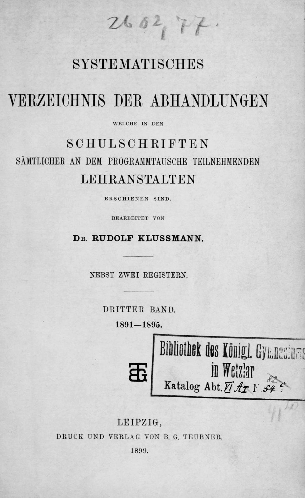 1891— 1895. Biliothek des Lönig.. GCyknerua u Wetzimn 55 Katalog Abt. Fr LA
