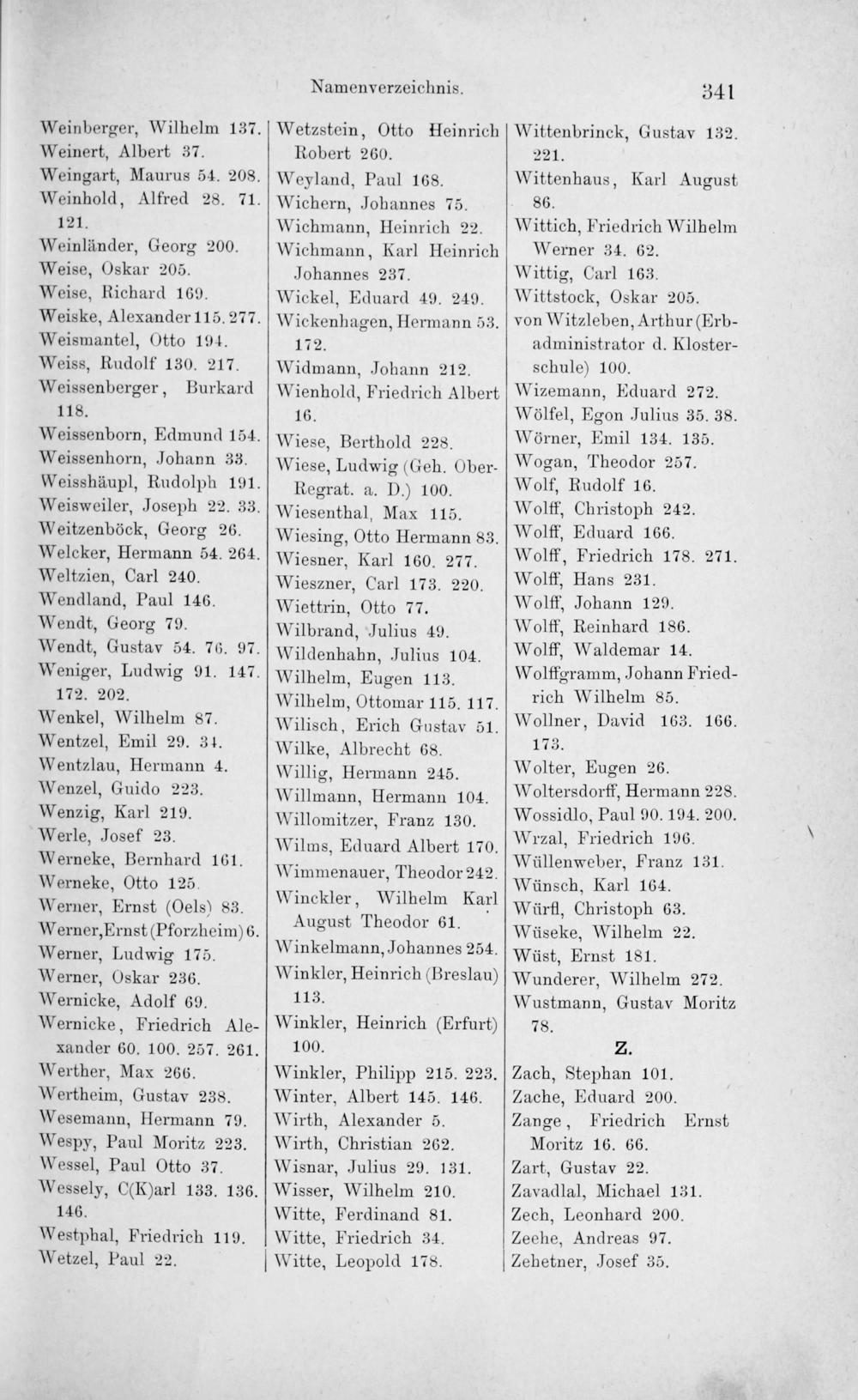 Weinberger, Wilhelm 137. Weinert, Albert 37. Weingart, Maurus 54. 208. Weinhold, Alfred 28. 71. 121. Weinländer, Georg 200. Weise, Oskar 205. Weise, Richard 169. Weiske, Alexander 115.277. Weismantel, Otto 194. Weiss, Rudolf 130. 217. Weissenberger, Burkard 118. Weissenborn, Edmund 154. Weissenhorn, Johann 33. Weisshäupl, Rudolph 191. Weisweiler, Joseph 22. 33. Weitzenböck, Georg 26. Welcker, Hermann 54. 264. Weltzien, Carl 240. Wendland, Paul 146. Wendt, Georg 79. Wendt, Gustav 54. 76. 97. Weniger, Ludwig 91. 147. 172. 202. Wenkel, Wilhelm 87. Wentzel, Emil 29. 31. Wentzlau, Hermann 4. Wenzel, Guido 223. Wenzig, Karl 219. Werle, Josef 23. Werneke, Bernhard 161. Werneke, Otto 125 Werner, Ernst(Oels) 83. Werner, Ernst(Pforzheim) 6. Werner, Ludwig 175. Werner, Oskar 236. Wernicke, Adolf 69. Wernicke, Friedrich Ale- xander 60. 100. 257. 261. Werther, Max 266. Wertheim, Gustav 238. Wesemann, Hermann 79. Wespy, Paul Moritz 223. Wessel, Paul Otto 37. Wessely, C(K)arl 133. 136. 146. Westphal, Friedrich 119. Wetzel, Paul 22.