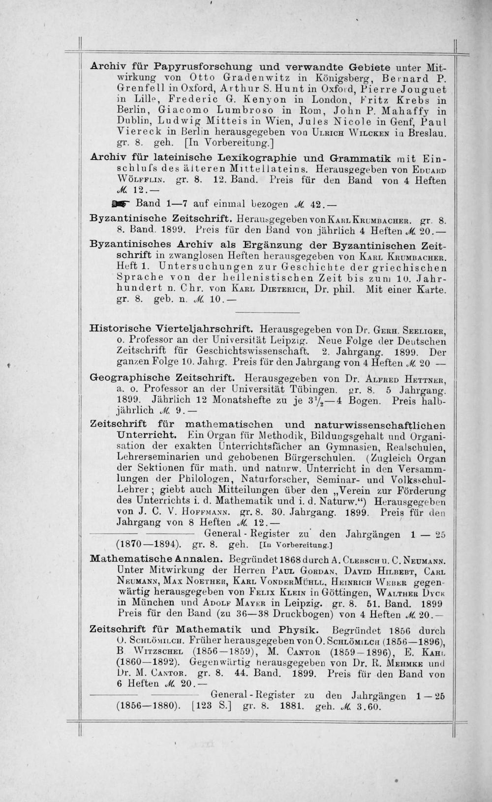 Zeitschrift für mathematischen und naturwissenschaftlichen Unterricht. Ein Organ für Methodik, Bildungsgehalt und Organi- sation der exakten Unterrichtsfächer an Gymnasien, Realschulen, Lehrerseminarien und gehobenen Bürgerschulen.(Zugleich Organ der Sektionen für math. und naturw. Unterricht in den Versamm- lungen der Philologen, Naturforscher, Seminar- und Volksschul- Lehrer; giebt auch Mitteilungen über den„Verein zur Förderung des Unterrichts i. d. Mathematik und i. d. Naturw.“) Herausgegeben von J. C. V. HorphANN. gr. 8. 30. Jahrgang. 1899. Preis für den Jahrgang von 8 Heften ℳ 12.—.
