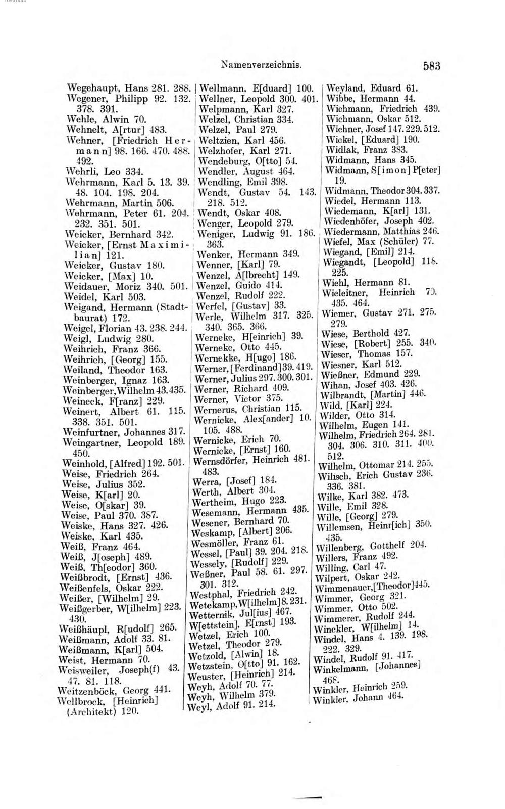 Wegehaupt. Hans 281. 288. Wellmann. Eſduard] 100. Weyland, Eduard 61. Wegener, Philipp 92. 132. Wellner, Leopold 300. 401. Wibbe, Hermann 44.