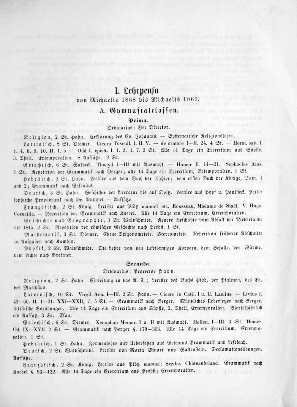 A. Gymnaſualclaſſen. Prima. Ordinarius: Der Director. 1