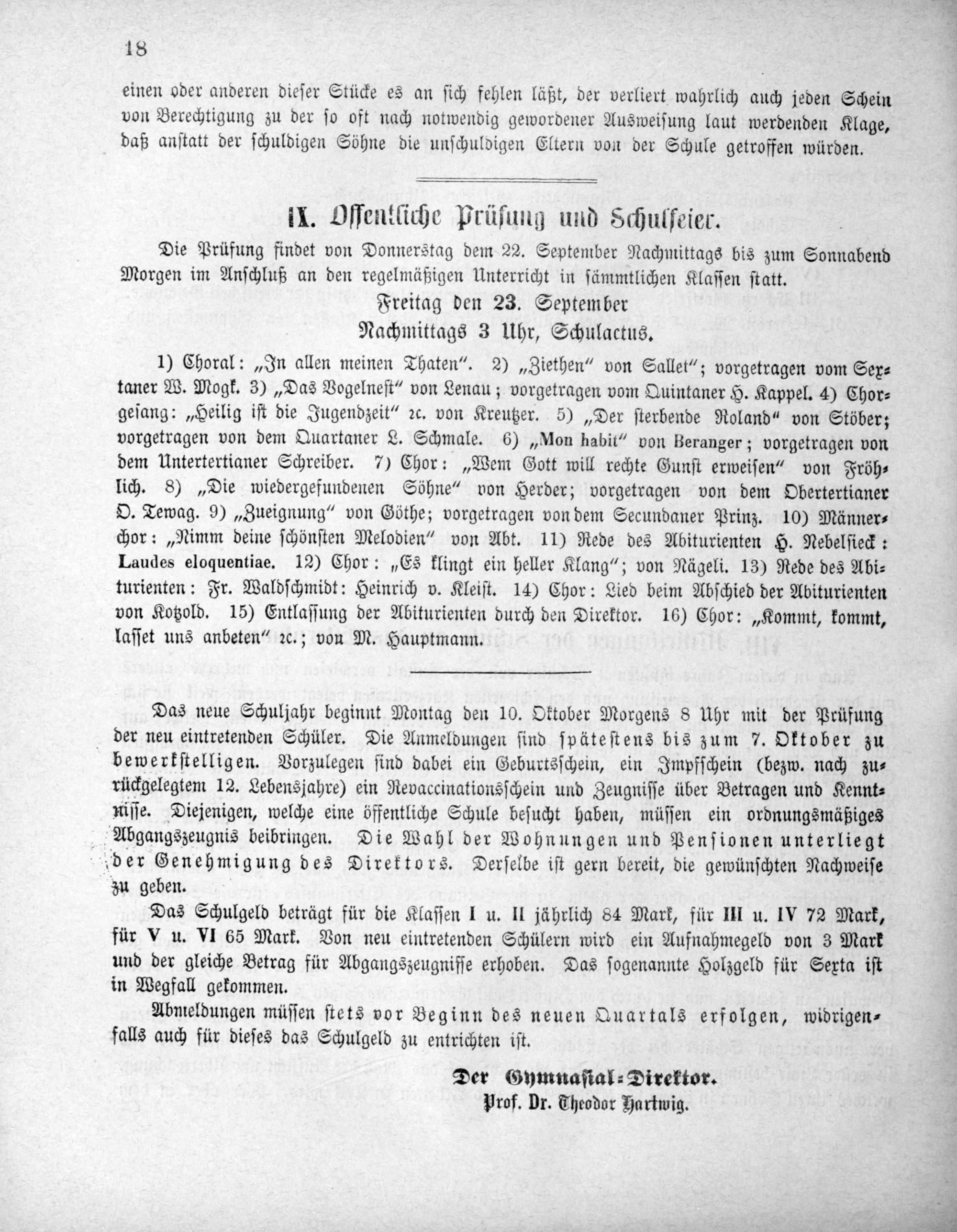II. Offentliche Prüſung und Schulſeier. Die Prüfung findet von Donnerstag dem 22. September Nachmittags bis zum Sonnabend Morgen im Anſchluß an den regelmäßigen Unterricht in ſämmtlichen Klaſſen ſtatt. Freitag den 23. September Nachmittags 3 Uhr, Schulactus.