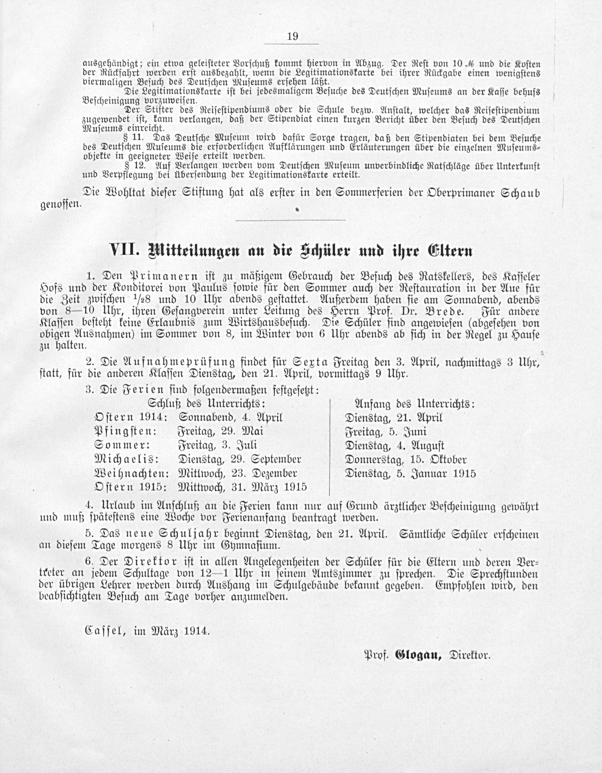 Caſſel, im März 1914. Prof. Glogau, Direktor.