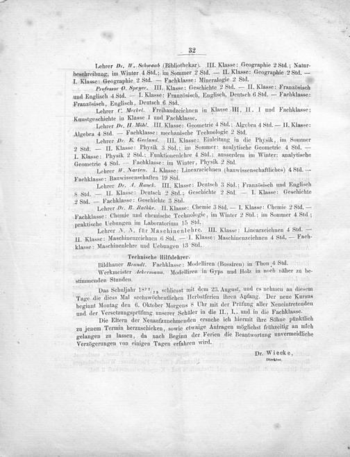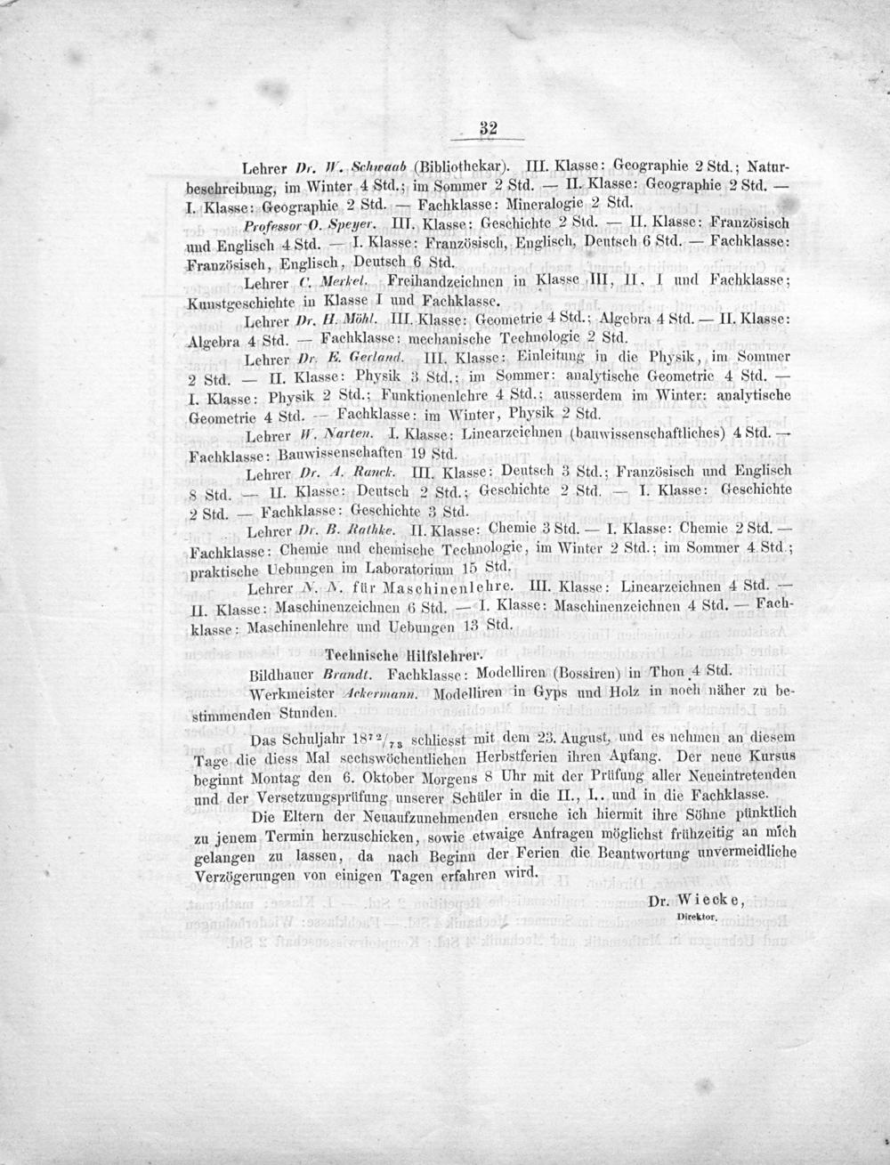 Lehrer Dr. W. Schwaab(Bibliothekar). III. Klasse: Geographie 2 Std.; Natur- beschreibung, im Winter 4 Std.; im Sommer 2 Std.— II. Klasse: Geographie 2 Std.— I. Klasse: Geographie 2 Std.— Fachklasse: Mineralogie 2 Std..
