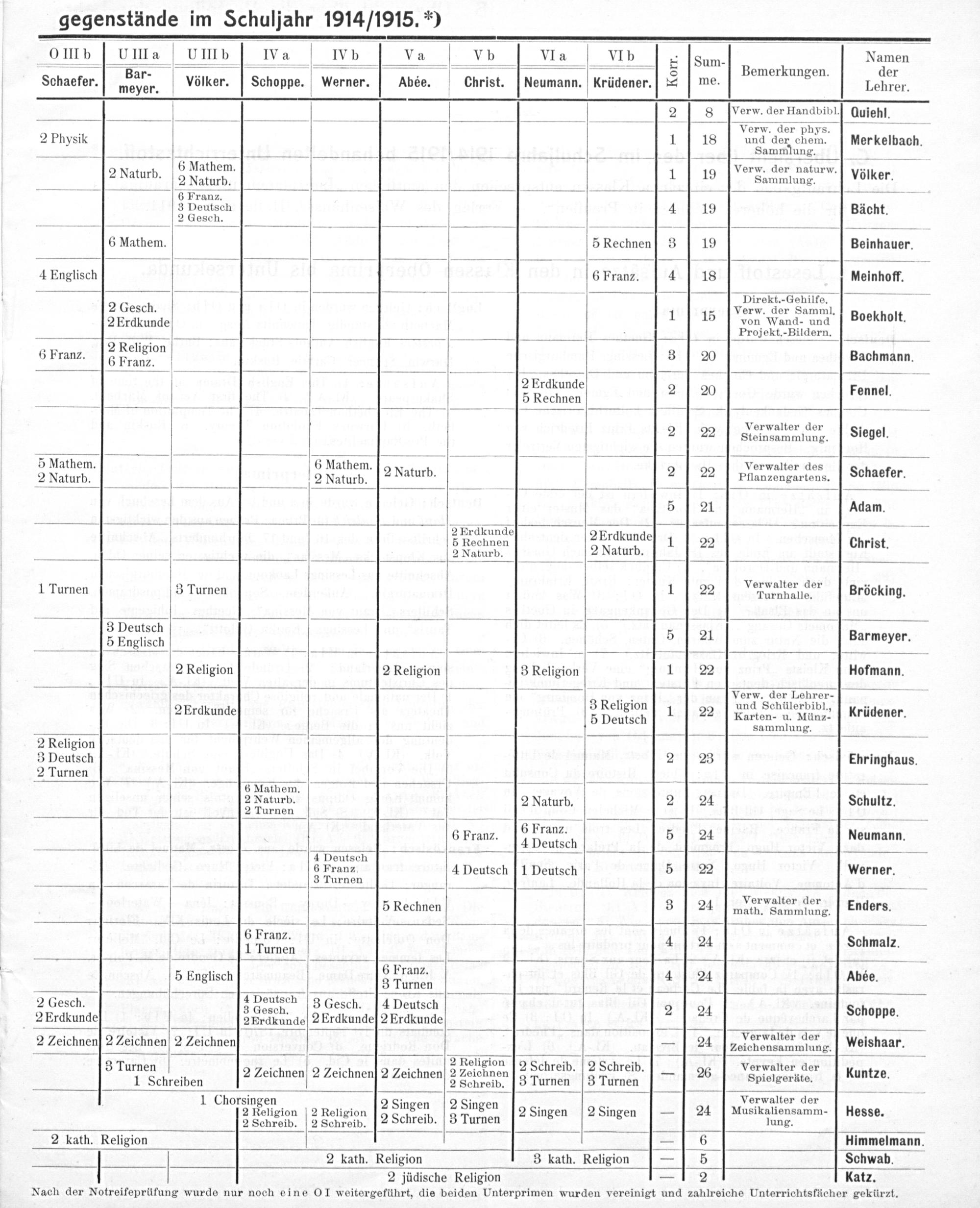O III b U IIIa U III b IV a IV b Va V b VIa VI b s Namen ———-—õ——V————[Sum- Bar.. 4 5 Bemerkungen. der Schaefer. meyer Völker. Schoppe. Werner. Abée. Christ.(Neumann. Krüdener. ³ me Lehrer. 2 8 NVIerw. der Handbibl. Quiehl. 4 Verw. der phyys. 2 Physik 1 18 und der chem. Merkelbach. — 4 Sammüfung. 2 Naturb. 5 Nathem. 1 19[verNrdenntned. Väluer. 6 Franz. 8 3 Deutsch 4 19 Bächt. 2 Gesch. L. 6 Mathem. 5 Rechnen 3 19 Beinhauer. 4 Englisch 6 Franz. 4 18 Meinhoff. 2 Gesch 4. Direkt.-Gehilfe. esch. Verw. der Samm!l. 4 1 15 Wand- und Boekholt. 2 rdkunde 1 ProjektBildern. 6 Franz 2 Remgion 3 20 Bachmann ſé Franz. 2 Erdkunde B Rechnen 2 20 Fennel. V. lter de 1 2 22 Srundarnanſaar. Siegel. 5 Mathem. 6 Mathem. TKiga:. 1 Verwalter des 2 Naturb. 2 Naturb 2 Naturb. 2 22 Pfanzongartens. Schaefer. 5 21 Adam. 2 Erdkunde 2 4 5 eereern 2Erdkunde 1 22 Christ. 2 Naturb. 2 Naturb. 1 Turnen 3 Turnen 1 22 erwaltender] Pröoking. — 3 Deutsch 1 1 5 Englisch 5 21 Barmeyer. 2 Religion 2 Religion 3 Religion 1 22 Hofmann. *. Verw. der Lehrer- 2Erdkunde 3 Religion 1 22 mund Schülerbitl, Krüdener. — sammlung.. 2 Religion 3 Deutsch 2 23 Ehringhaus. 2 Turnen 6 Mathem.—— 2 Naturb. 2 Naturb. 2 24 Schultz. 2 Turnen.— . 6 Franz. 6 Franz. 4 Deutsch 5 24 Neumann. 4 Deutsch 95, 6 Franz. 4 Deutsch 1 Deutsch 5 22 Werner. 3 Turnen. 5 Rechnen 3 24 manr Alterndeng.] Enders. 6 Franz. 4] 24 Schmalz. 1 Turnen— 5 Englisch 6 Pranen 4 24 Abée. 2 Gesch. 4 Deutsch 3 Gesch. 4 Deutsch„ 2 Erdkunde 3enen, de 2Erdkunde 2 Erdkunde 2 24 Sohoppe. 2 Zeichnen 2 Zeichnen 2 Zeichnen— 24 zelomnanduug. Wweishaar.— 3 Turnen;. 527 2 Religion 2 Schreib. 2 Schreib.— Verwalter der 1 Sctreiben 2 Zeichnen 2 Zeichnen] 2 Zeichnen 2 Zolehnen 3 Turnen 3 Turnen 26 Spieigeräte. Kuntze. 1 Chorsingen 2 Singen 2 Singen Worwalton den Saon ſ2 Rellgi 1 1— 24 Musikaliens Hesse. ¹ doneann(2 Behenn(2 Schreib. 3 Turnen[2 Singen 2 Sigen e 2 kath. Religion— 6 Himmelmann. 2 kath. Religion 3 kath. Religion— 5 Schwab. 2 jüdische Religion— 1 2 Katz.