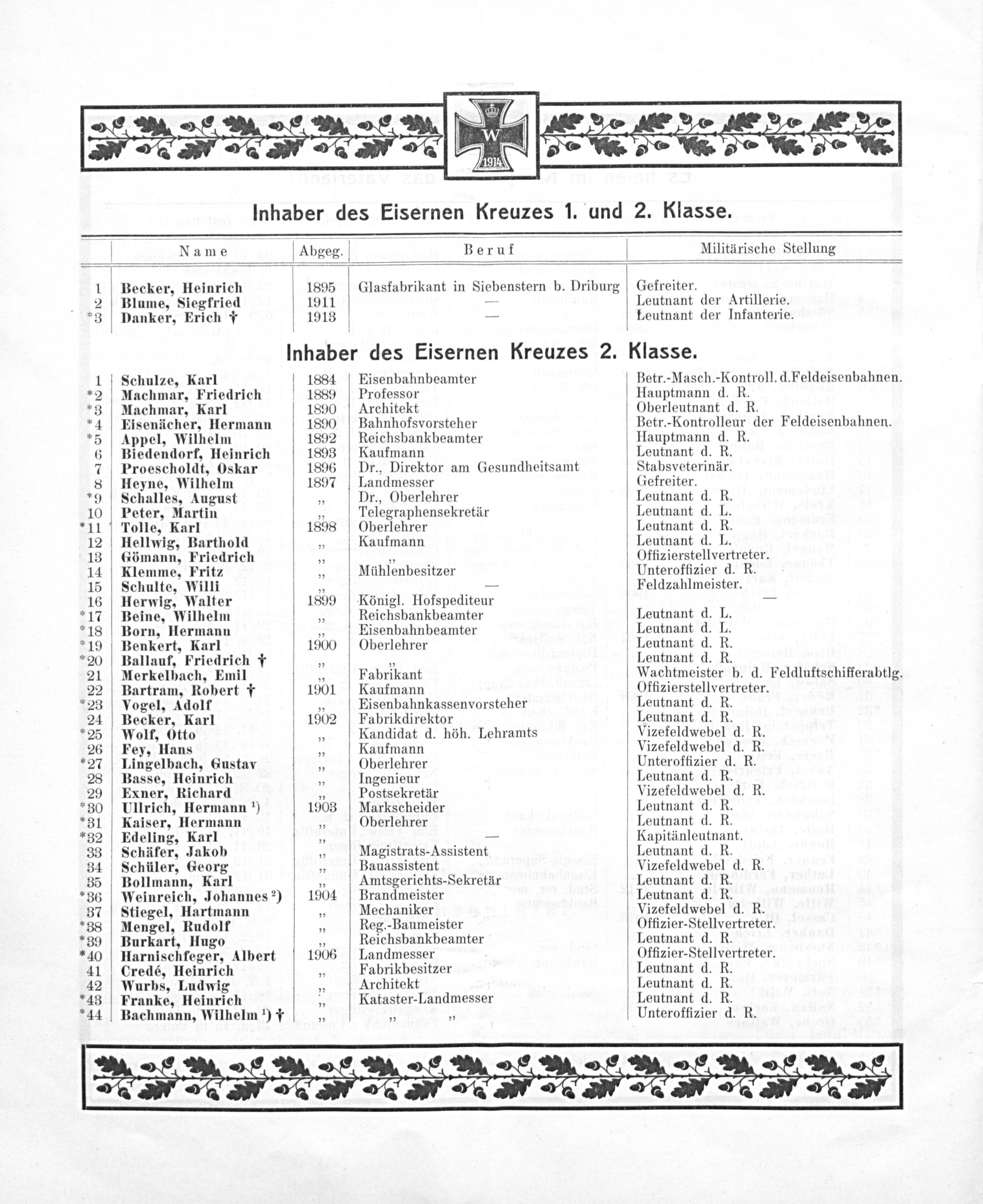24 Becker, Karl 1902 Fabrikdirektor Leutnant d. R. 25 Wolf, Otto„ Kandidat d. höh. Lehramts Vizefeldwebel d. R.