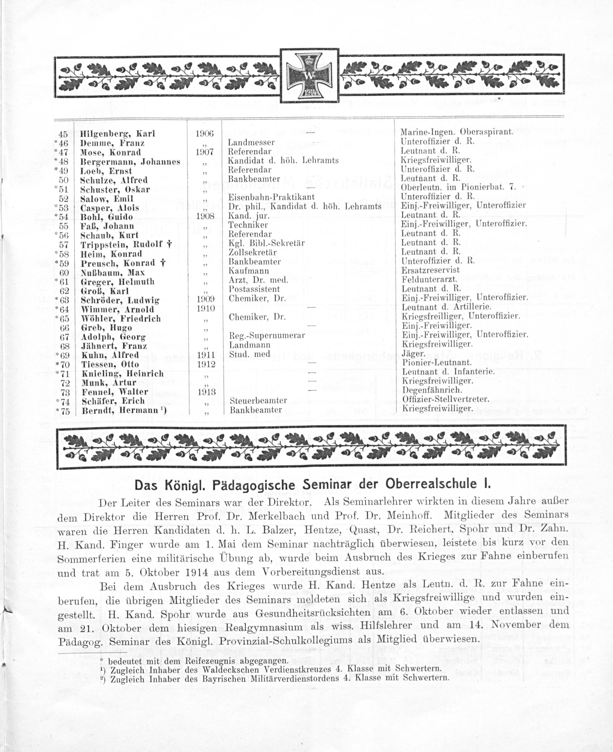 * bedeutet mit dem Reifezeugnis abgegangen. 3 ¹) Zugleich Inhaber des Waldeckschen Verdienstkreuzes 4. Klasse mit Schwertern. ²) Zugleich Inhaber des Bayrischen Militärverdienstordens 4. Klasse mit Schwertern.