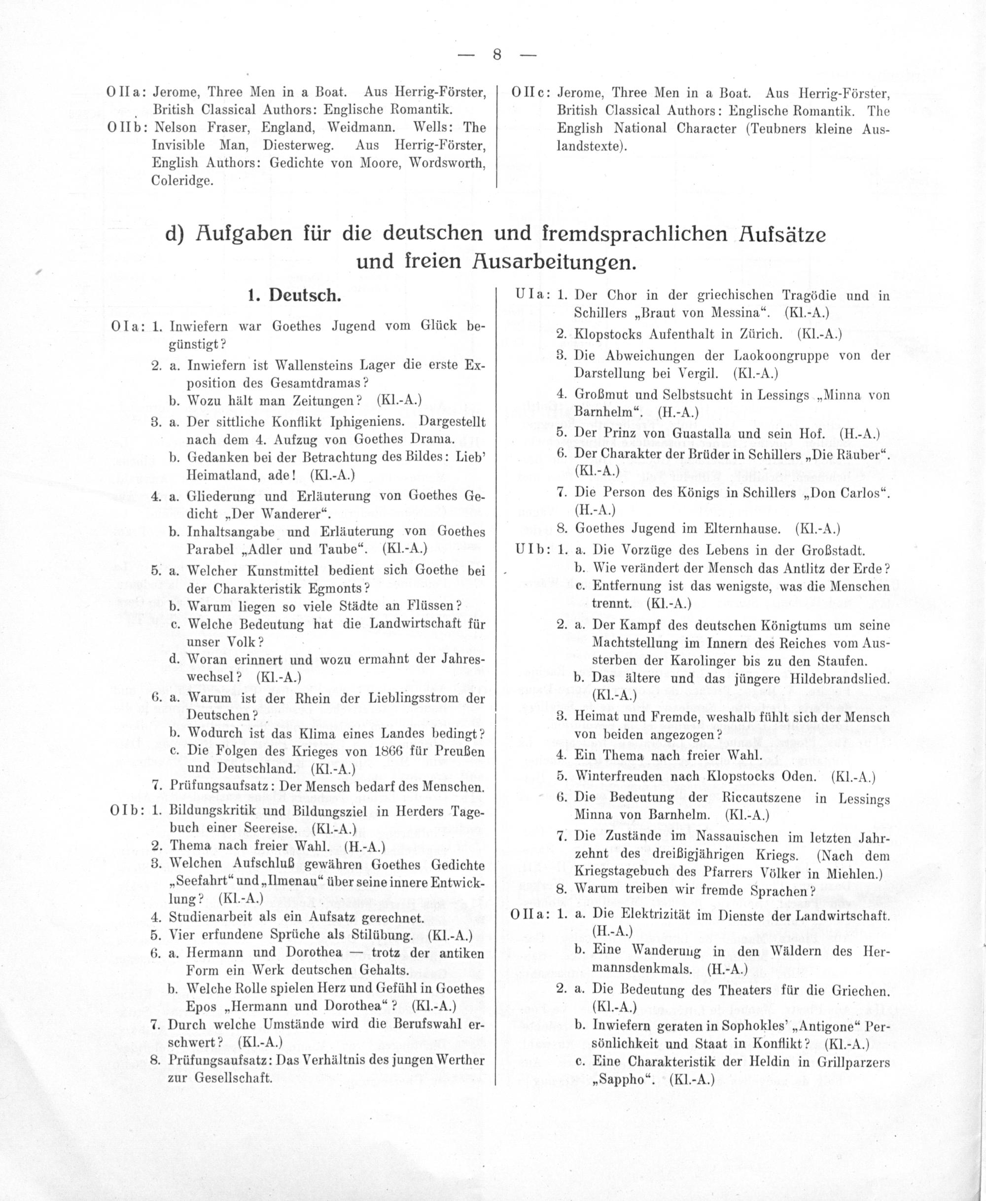d) Aufgaben für die deutschen und fremdsprachlichen Aufsätze und freien Ausarbeitungen.