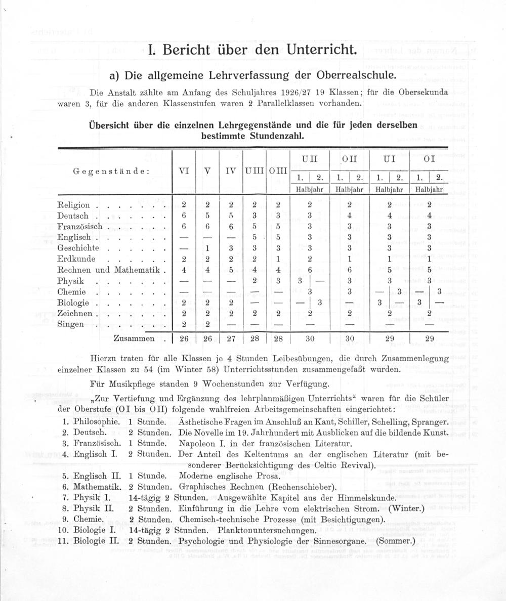 Die Anstalt zählte am Anfang des Schuljahres 1926/27 19 Klassen; für die Obersekunda waren 3, für die anderen Klassenstufen waren 2 Parallelklassen vorhanden.