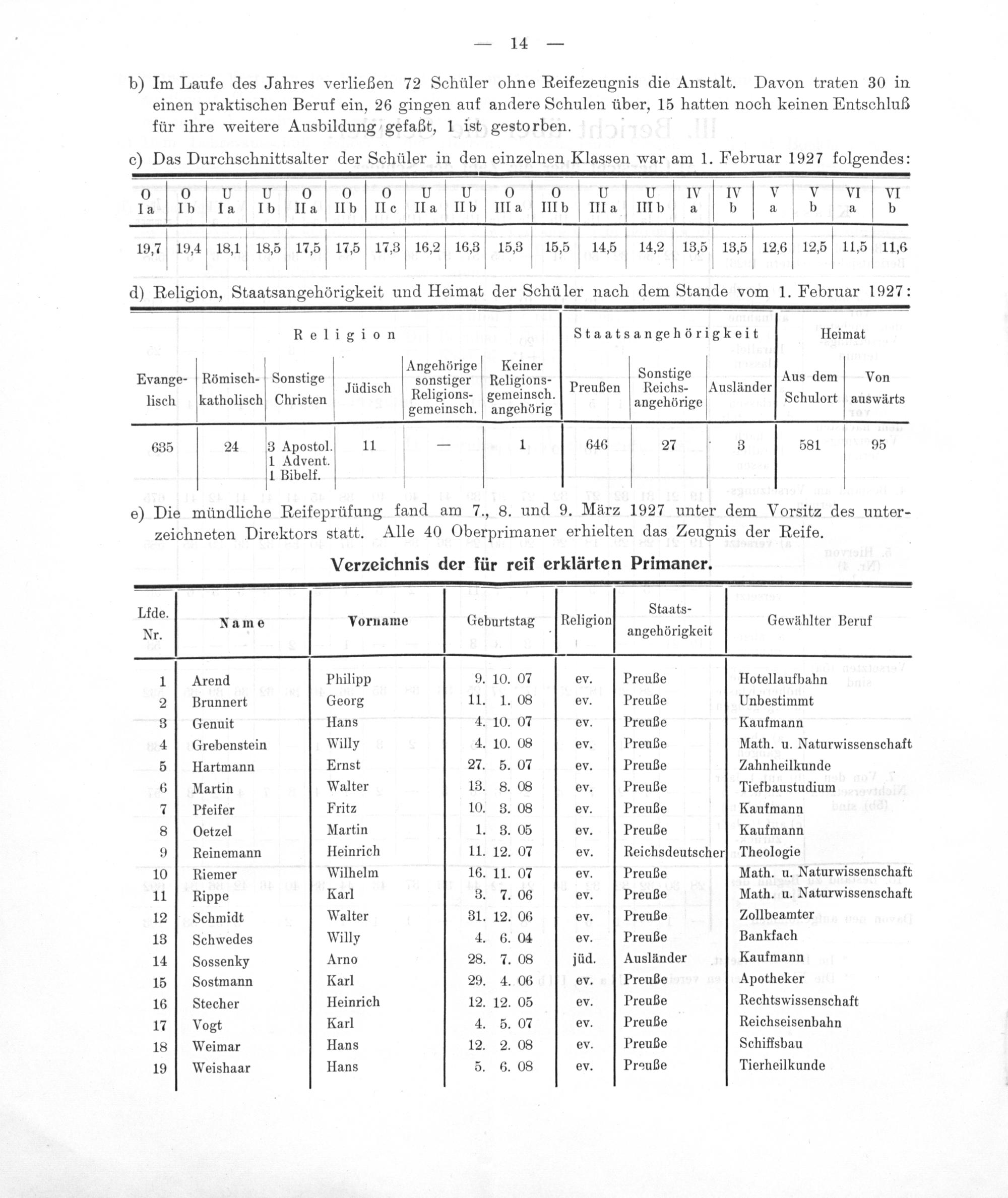 e) Die mündliche Reifeprüfung fand am 7., 8. und 9. März 1927 unter dem Vorsitz des unter- zeichneten Direktors statt. Alle 40 Oberprimaner erhielten das Zeugnis der Reife.