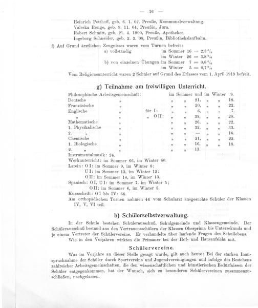 f) Auf Grund ärztlichen Zeugnisses waren vom Turnen befreit: a) vollständig im Sommer 16= 2,3% im Winter 26= 3,8% b) von einzelnen Ubungen im Sommer 7= 0,8% im Winter 5= 0,7% Vom Religionsunterricht waren 2 Schüler auf Grund des Erlasses vom 1. April 1919 befreit.