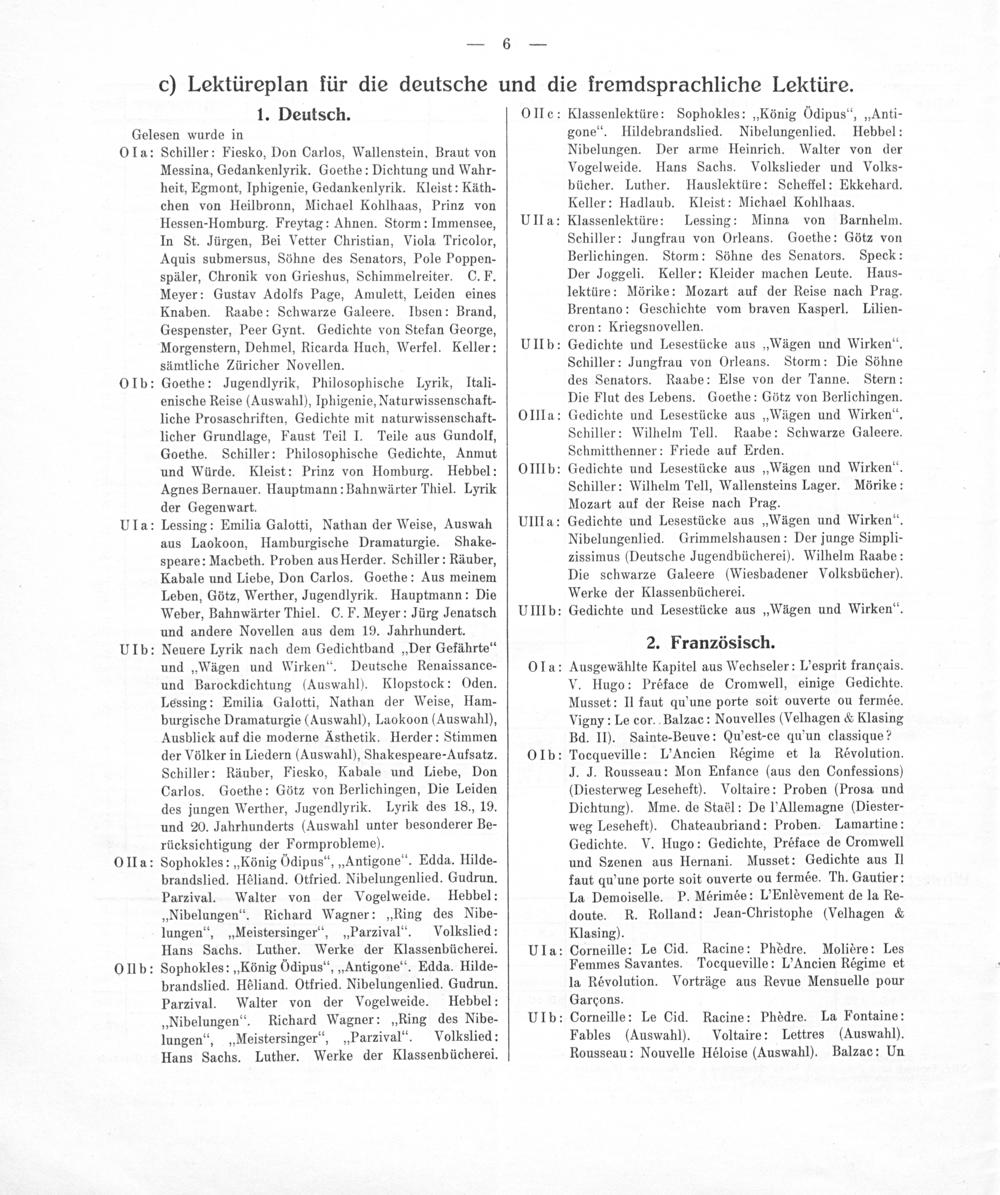 Klassenlektüre: Sophokles:„König Odipus“,„Anti- gone“. Hildebrandslied. Nibelungenlied. Hebbel: Nibelungen. Der arme Heinrich. Walter von der Vogelweide. Hans Sachs. Volkslieder und Volks- bücher. Luther. Hauslektüre: Scheffel: Ekkehard. Keller: Hadlaub. Kleist: Michael Kohlhaas. Klassenlektüre: Lessing: Minna von Barnhelm. Schiller: Jungfrau von Orleans. Goethe: Götz von Berlichingen. Storm: Söhne des Senators. Speck: Der Joggeli. Keller: Kleider machen Leute. Haus- lektüre: Mörike: Mozart auf der Reise nach Prag. Brentano: Geschichte vom braven Kasperl. Lilien- cron: Kriegsnovellen.