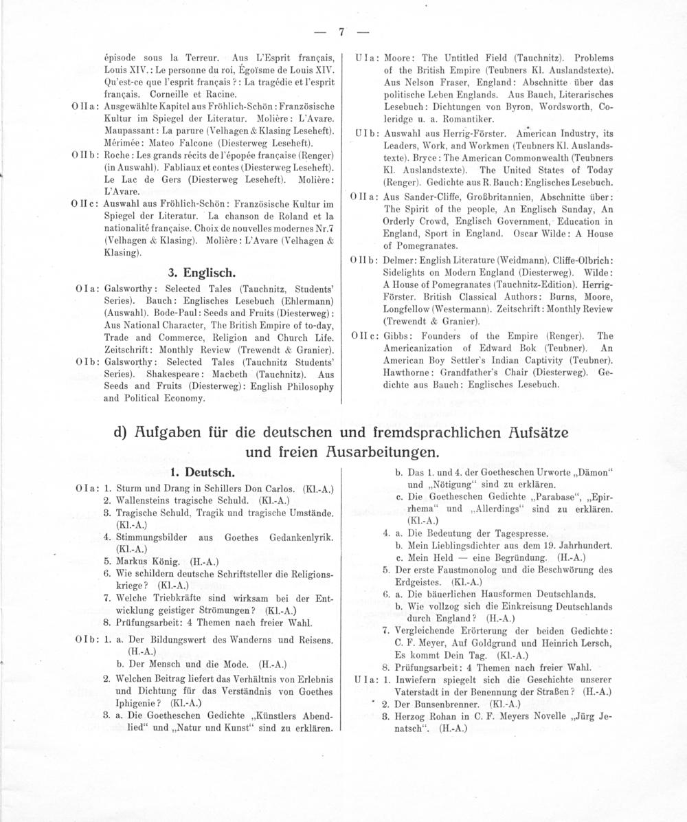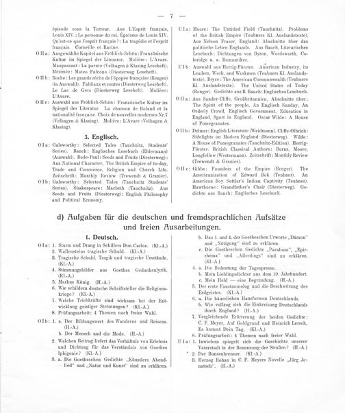 6. a. Die bäuerlichen Hausformen Deutschlands. b. Wie vollzog sich die Einkreisung Deutschlands durch England?(IH. A.) 3 7. Vergleichende Erörterung der beiden Gedichte: C. F. Meyer, Auf Goldgrund und Heinrich Lersch, Es kommt Dein Tag.(Kl.-A.) 8. Prüfungsarbeit: 4 Themen nach freier Wahl. 1. Inwiefern spiegelt sich die Geschichte unserer Vaterstadt in der Benennung der Straßen?(H.-A.) 2. Der Bunsenbrenner.(Kl.-A.) 3. Herzog Rohan in C. F. Meyers Novelle„Jürg Je-