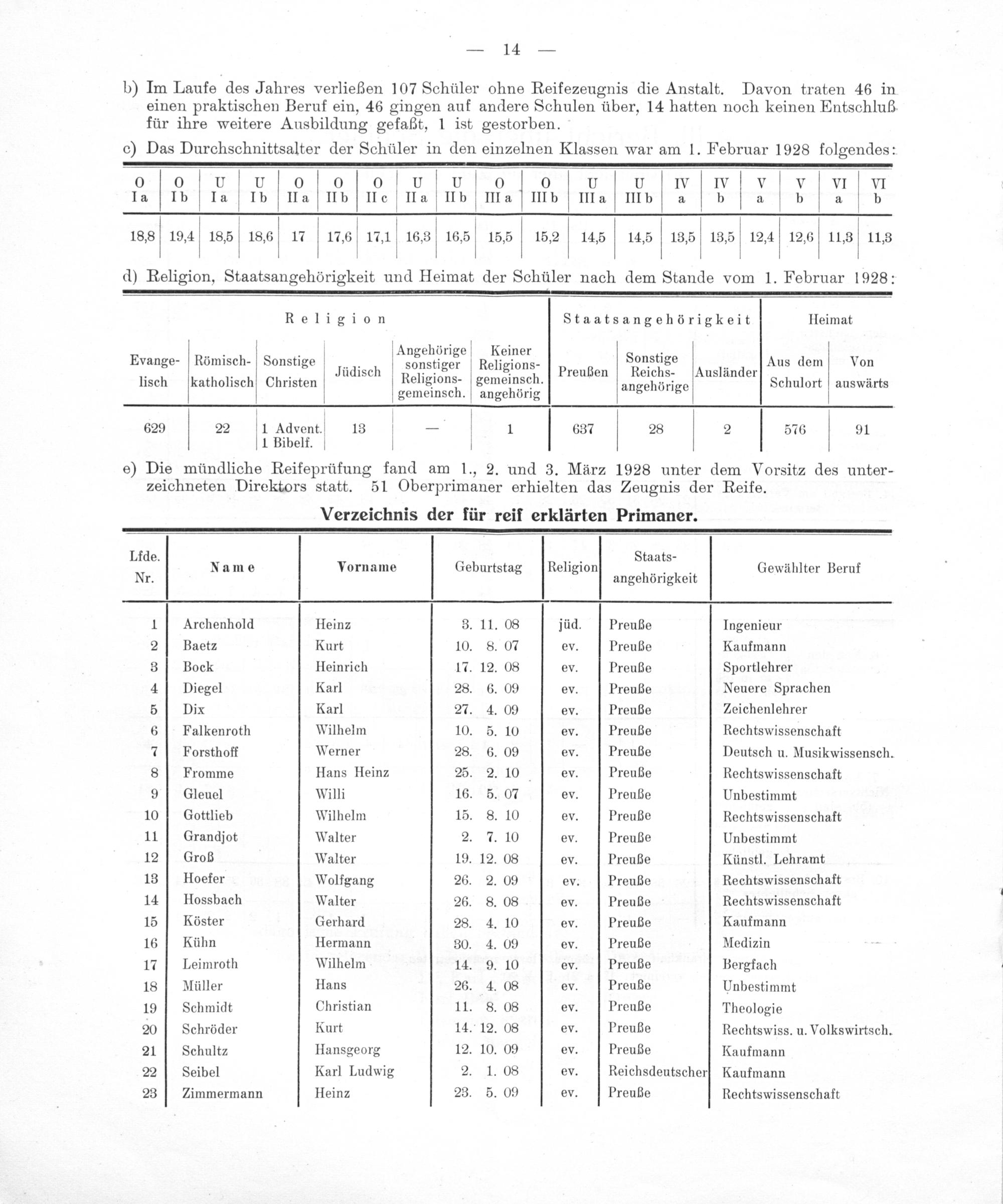 e) Die mündliche Reifeprüfung fand am 1., 2. und 3. März 1928 unter dem Vorsitz des unter-