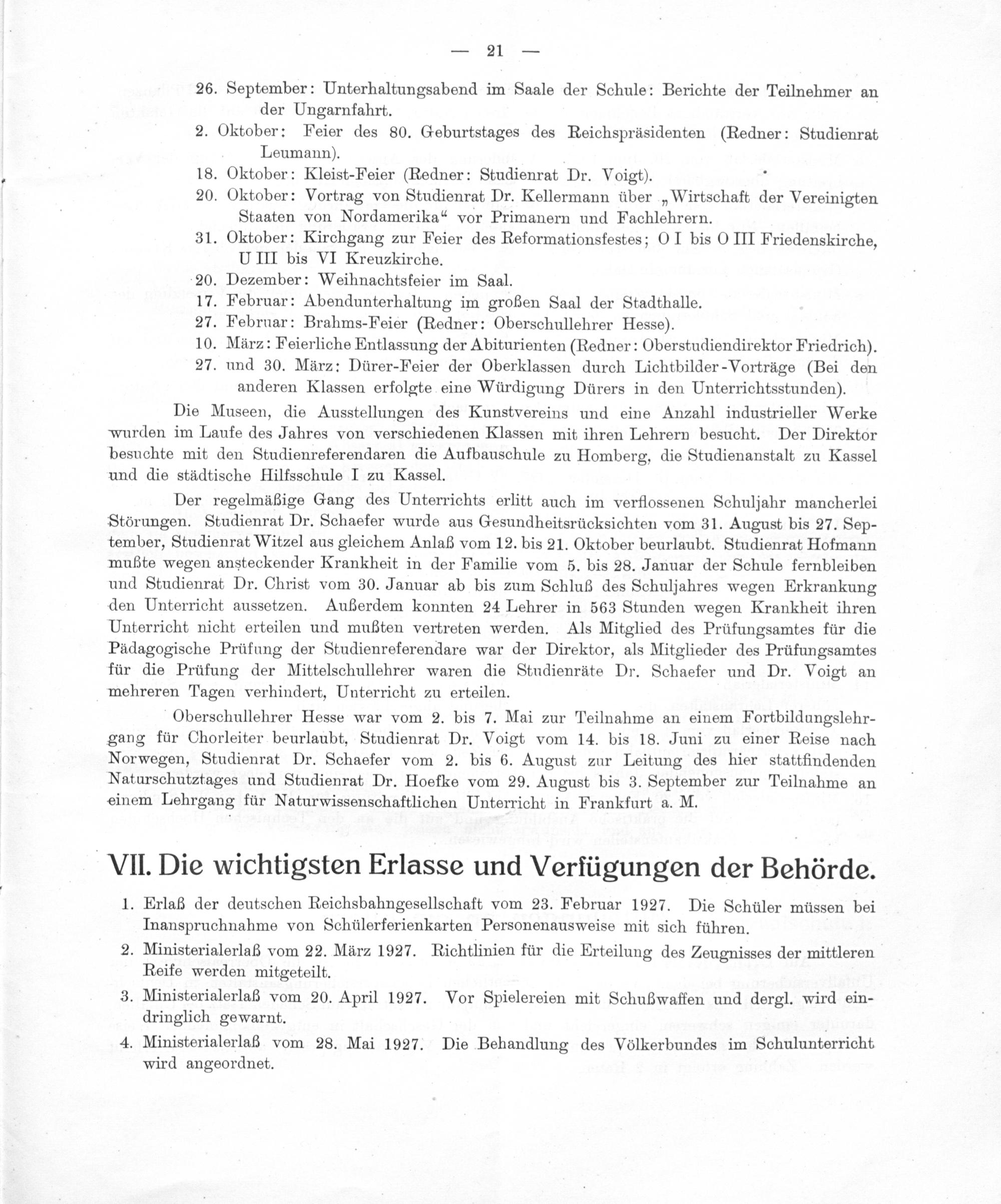 Die Museen, die Ausstellungen des Kunstvereins und eine Anzahl industrieller Werke wurden im Laufe des Jahres von verschiedenen Klassen mit ihren Lehrern besucht. Der Direktor besuchte mit den Studienreferendaren die Aufbauschule zu Homberg, die Studienanstalt zu Kassel und die städtische Hilfsschule I zu Kassel.