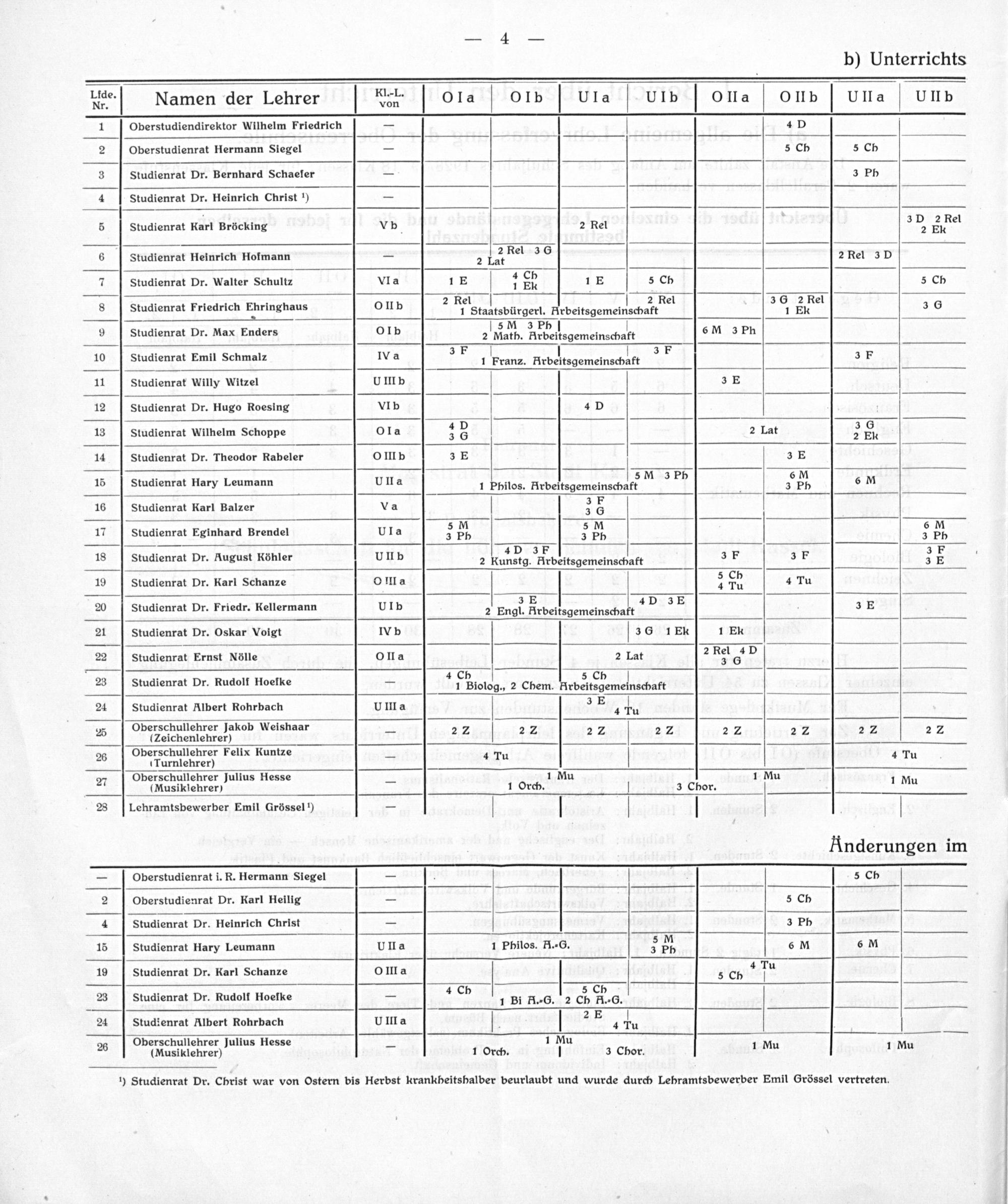 ¹) Studienrat Dr. Christ war von Ostern bis Herbst krankheitsbalber beurlaubt und wurde durch Lebramtsbewerber Emil Grössel vertreten.