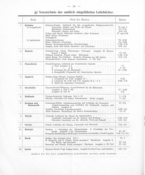 Fach Titel des Buches Klasse 1 Religion Schuster-Franke, Lehrbuch für den evangelischen Religionsunterricht. a) evangelische Unterstufe: Helden und Werke der Kirche...... VI und V. Mittelstufe: Einheitsband. IV- UII Oberstufe: Glaube und Leben.... 0 IIO O1 Völker und Strack, Biblisches Lesebuch, Altes Testament. IV und O0II Bibel(Neues Testament). Gesangbuch. b) katholische Einheitskatechismus. VI— OIII Ecker, Biblische Geschichte... VI OIII Bremer, Kirchengeschichtliche Charakterbilder.. UIII- UII Junglas, Licht und Leben, Glaubens- und Sittenlehre 0 II 01 2 Deutsch Schmidt-Voigt, Preitz, Winneberger, Lebensgut. Ausgabe für Hessen- Kassel, 7 Bände...... VIO O01 Wilhelm Friedrich, Frische Fahrt. Mittelstufe. UIII— UII Jakob Kneip, Der Gefährte. Deutsche Dichtung aus 200 Jahren 0 II— 01 Florstedt-Stieber, Neue deutsche Sprachlehre. I.—III. Teil. 3 Französisch Grund-Neumann, Lehrbuch der französischen Sprache. 1. Neue Ausgabe A 1. VI 2. A1. V-—IV 3. Lesebuch für die Mtelstnie.. IVO OIII 4. Kurzgefaßte Grammatik der französischen Sprache. 4 Englisch Dinkler-Zeiger-Humpf, Learning English. 1. Grundbuch für UIII, Ausgabe D 1.. UIII 2. Lehrbuch für O III und UII. Ausgabe D 2/ F 2 0 II, UII 3. Abriß der englischen Grammatik. 5 Geschichte Pinnow-Steudel-Wilmanns, Geschichtsbuch für die Mittelstufe. Ausgabe A, Teil I—III....... IV— OIII Ausgabe B, Teil IV. UII 6 Erädkunde Fischer-Geistbeck, Erdkunde, Teil—IV.... VSUII Diercke, Schulatlas für höhere Lehranstalten. Große Ausgabe.—01 7 Rechnen und Lietzmann-Zühlke, Aufgabensammlung und Leitfaden der Geometrie— 01 Mathematik Aufgabensammlung und Leitfaden der Arithmetik, Analysis und Algebra. Ausgabe B. Schülke, Vieistellige Logarithmentafeln. 0IIIZ 01 Albin Hofmann, Rechenbuch für höhere Knabenschulen VI— IV 8 Physik Grimsehl, Lehrbuch der Physik für Realanstalten. Unterstufe, bearbeitet von Dr. Kramer und Wolfram.. UIII— UII Oberstufe, bearbeitet von Dr. Albrecht, Weiß und Schauff 0 1I—01 9 Chemie Scheid, Leitfaden der Chemie, Unterstufe und Oberstufe UIIͤ 01 10 Biologie Smalian. 1. Grundzüge der Pflanzenkunde. 2. Grundzüge der Tier- kunde. Ausgabe A für Realanstalten. VI=IV Kraepelin, Einführung in die Biologie(bearbeitet von Schäffer). Große Ausgabe UII, UI, O1 11 Musik Dahlke, Das deutsche Lied. Teil I.......... VI, V H. Heinrichs und E. Pfusch, Frisch gesungen! Musikbuch. Ausgabe A. Für Mittel- und Oberstufe.. IVO 01 Heinrichs und Pfusch, Frisch gesungen! Chorbuch. Ausgabe A. III. Teil IV— 0I 12 Latein Salomon-Hartke-Vogt, Lingua Latina. Ausgabe B nebst Form- und Satzlehre 0 IIZ 01