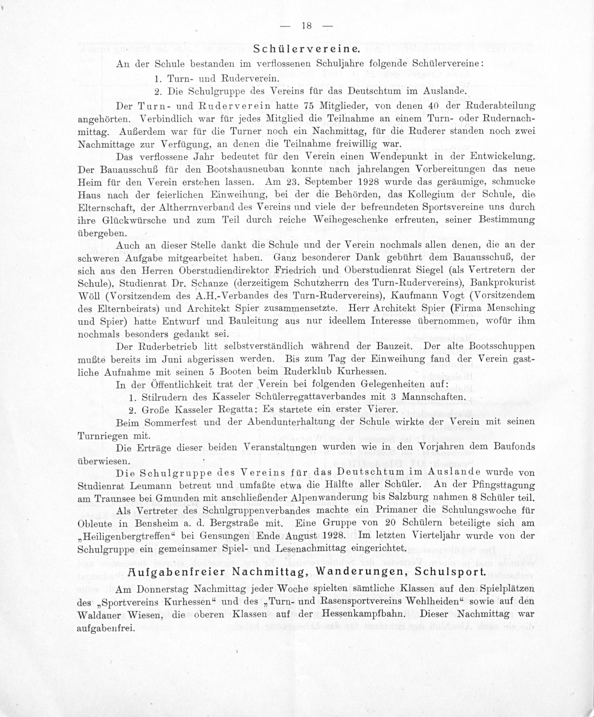 Das verflossene Jahr bedeutet für den Verein einen Wendepunkt in der Entwickelung. Der Bauausschuß für den Bootshausneubau konnte nach jahrelangen Vorbereitungen das neue Heim für den Verein erstehen lassen. Am 23. September 1928 wurde das geräumige, schmucke Haus nach der feierlichen Einweihung, bei der die Behörden, das Kollegium der Schule, die Elternschaft, der Altherrnverband des Vereins und viele der befreundeten Sportsvereine uns durch ihre Glückwürsche und zum Teil durch reiche Weihegeschenke erfreuten, seiner Bestimmung übergeben.