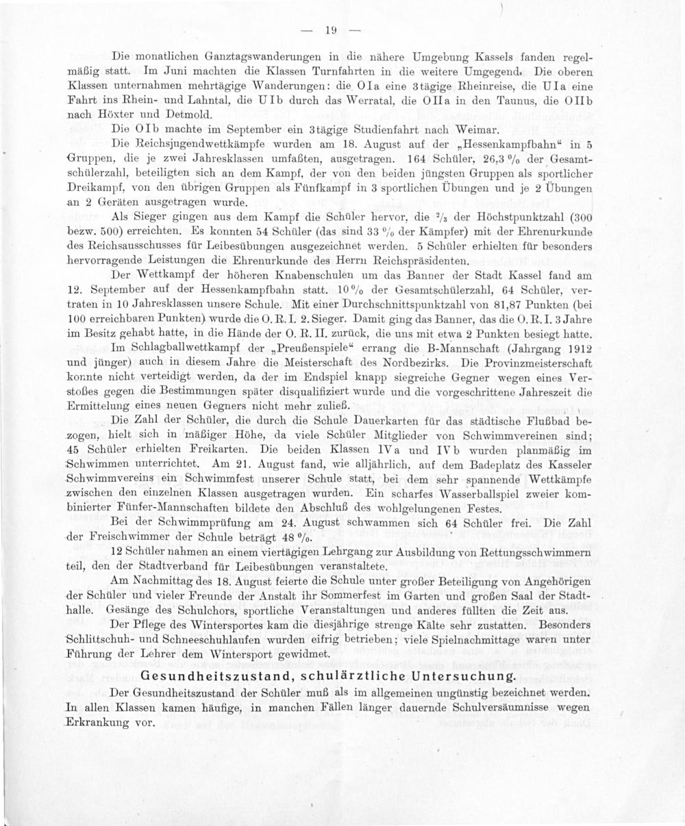 Die monatlichen Ganztagswanderungen in die nähere Umgebung Kassels fanden regel- mäßig statt. Im Juni machten die Klassen Turnfahrten in die weitere Umgegend. Die oberen Klassen unternahmen mehrtägige Wanderungen: die OIa eine 3tägige Rheinreise, die UIa eine Fahrt ins Rhein- und Lahntal, die UIb durch das Werratal, die OIIa in den Taunus, die OIIb nach Höxter und Detmold.