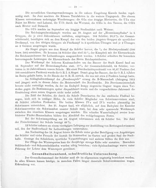 Der Wettkampf der höheren Knabenschulen um das Banner der Stadt Kassel fand am 12. September auf der Hessenkampfbahn statt. 10% der Gesamtschülerzahl, 64 Schüler, ver- traten in 10 Jahresklassen unsere Schule. Mit einer Durchschnittspunktzahl von 81,87 Punkten(bei 100 erreichbaren Punkten) wurde die O. R. I. 2. Sieger. Damit ging das Banner, das die O. R. I. 3 Jahre im Besitz gehabt hatte, in die Hände der O. R. II. zurück, die uns mit etwa 2 Punkten besiegt hatte.