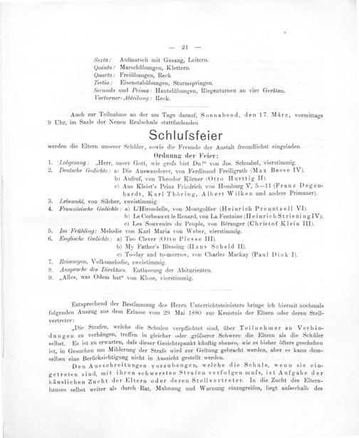 werden die Eltern unserer Schüler, sowie die Freunde der Anstalt freundlichst eingeladen. Ordnung der Feier: 1. Lobgesang-„Herr, unser Gott, wie groſs bist Du!“ von Jos. Schnabel, vierstimmig. 2. Deulsche Gedichte: a) Die Auswanderer, von Ferdinand Freiligrath(Max Beese IV). b) Aufruf, von Theodor Körner(Otto Hurttig II). c) Aus Kleist's Prinz Friedrich von Homburg V, 5— 11(Franz Degen- hardt, Karl Thöring, Albert Wilken und andere Primaner). Lebewohl, von Silcher, zweistimmig. 4. Franaösische Gedichte, a) L'Hirondelle, von Montgolfier(Beinrich Prenntzell VI). b) Le Corbeau et le Renard, von La Fontaine(HBeinrich StrieningIV). c) Les Souvenirs du Peuple, von Béranger(Christof Klein III). Im Frühling. Melodie von Karl Maria von Weber, vierstimmig. 6. Englische Gedichle⸗ a) Too Clever(Otto Plesse III). b) My Father's Blessing(DJans Scheld II). c) To-day and to-morrow, von Charles Mackay(Paul Dick IJ). 7. Reisesegen, Volksmelodie, zweistimmig. Ansprache des Direktors. Entlassung der Abiturienten. 9.„Alles, was Odem hat“ von Klose, vierstimmig.