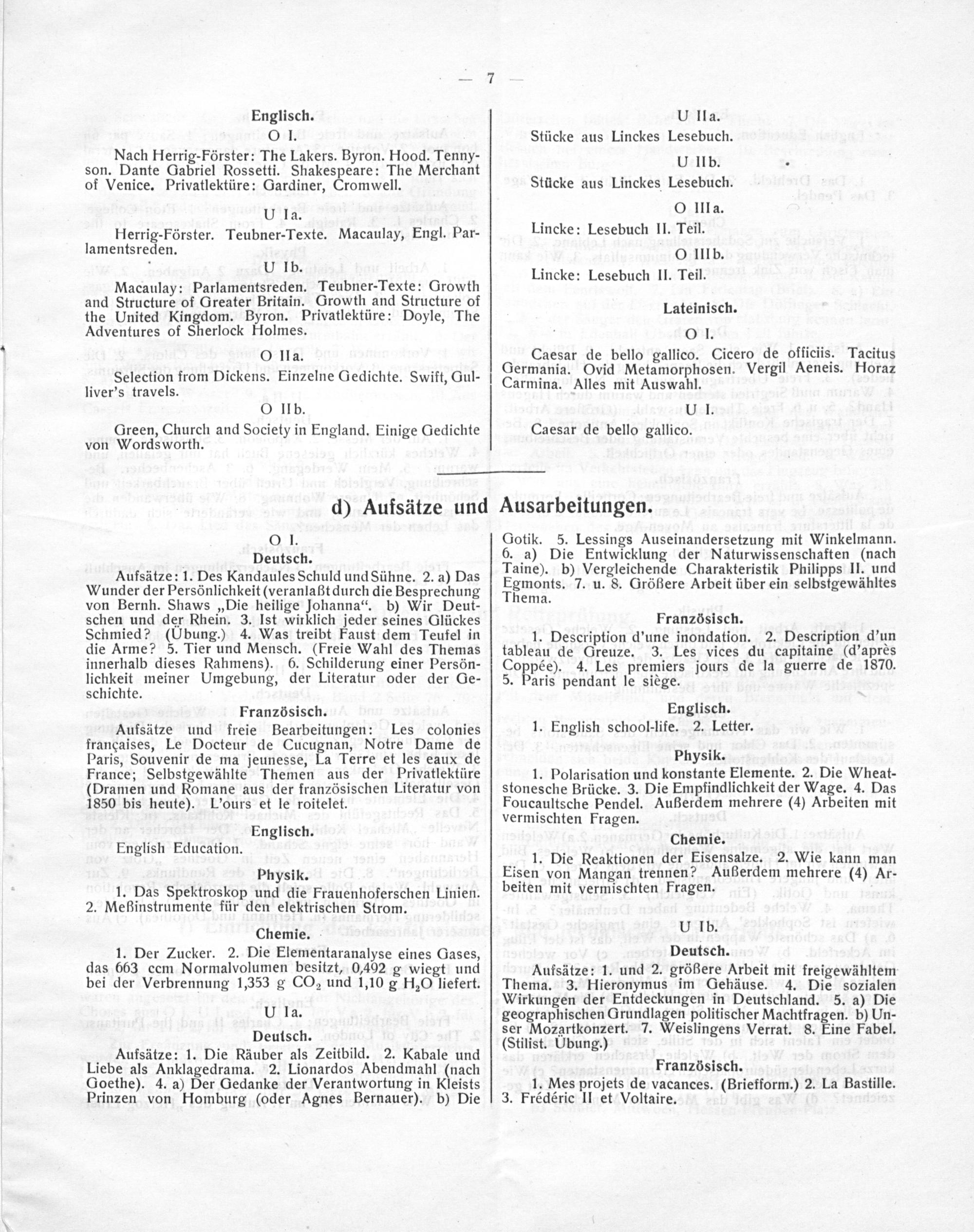 Aufsätze: 1. Des Kandaules Schuld und Sühne. 2. a) Das Wunder der Persönlichkeit(veranlaßt durch die Besprechung von Bernh. Shaws„Die heilige Johanna“. b) Wir Deut- schen und der Rhein. 3. Ist wirklich jeder seines Glückes Schmied?(Ubung.) 4. Was treibt Faust dem Teufel in die Arme? 5. Tier und Mensch.(Freie Wahl des Themas innerhalb dieses Rahmens). 6. Schilderung einer Persön- lichkeit meiner Umgebung, der Literatur oder der Ge- schichte.