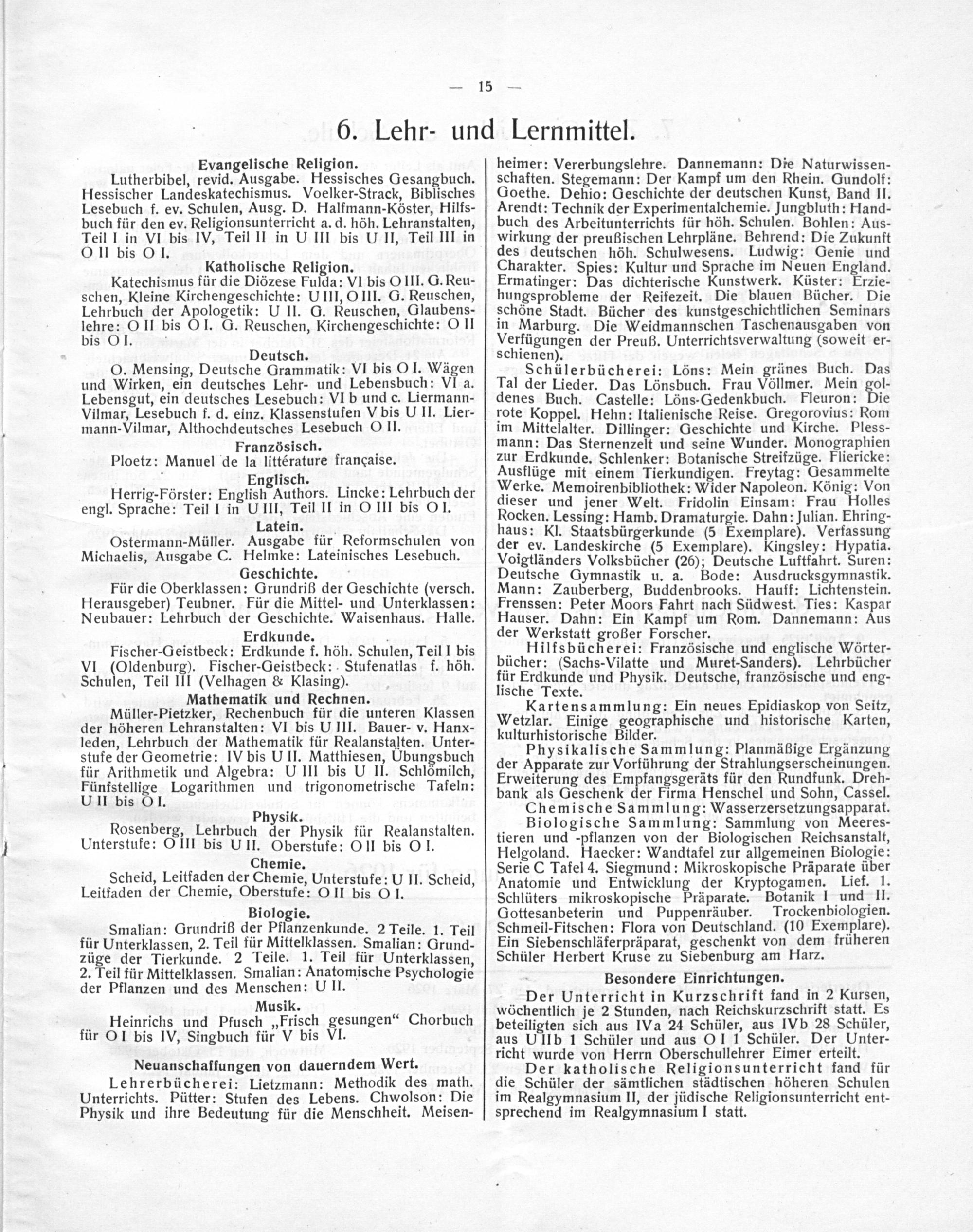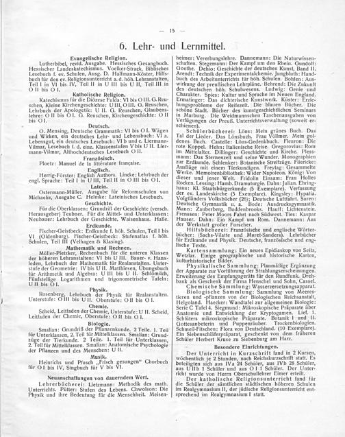Schülerbücherei: Löns: Mein gränes Buch. Das Tal der Lieder. Das Lönsbuch. Frau Völlmer. Mein gol- denes Buch. Castelle: Löns-Gedenkbuch. Fleuron: Die rote Koppel. Hehn: Italienische Reise. Gregorovius: Rom im Mittelalter. Dillinger: Geschichte und Kirche. Pless- mann: Das Sternenzeſt und seine Wunder. Monographien zur Erdkunde. Schlenker: Botanische Streifzüge. Fliericke: Ausflüge mit einem Tierkundigen. Freytag: Gesammelte Werke. Memoirenbibliothek: Wider Napoleon. König: Von dieser und jener Welt. Fridolin Einsam: Frau Holles Rocken. Lessing: Hamb. Dramaturgie. Dahn: Julian. Ehring- haus: Kl. Staatsbürgerkunde(5 Exemplare). Verfassung der ev. Landeskirche(5 Exemplare). Kingsley: Hypatia. Voigtländers Volksbücher(26); Deutsche Luftfahrt. Suren: Deutsche Gymnastik u. a. Bode: Ausdrucksgymnastik. Mann: Zauberberg, Buddenbrooks. Hauff: Lichtenstein. Frenssen: Peter Moors Fahrt nach Südwest. Ties: Kaspar Hauser. Dahn: Ein Kampf um Rom. Dannemann: Aus der Werkstatt großer Forscher.
