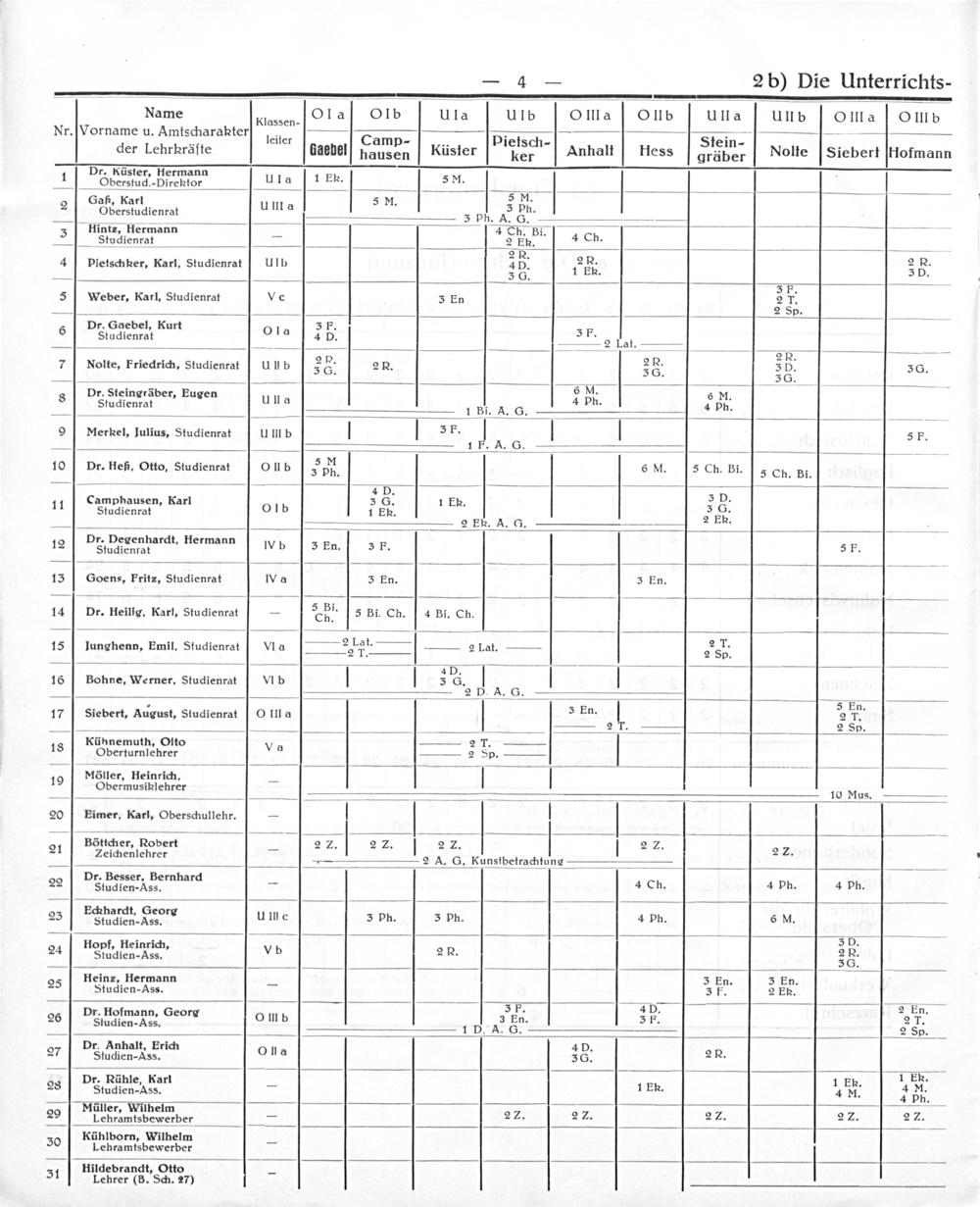 — 4— 2 b) Die Unterrichts- ——————————— Name Klassen⸗ Ola Olb Ula Ulb O III a OIllb UIla UIl b OIIl a OIII b Nr. Vorname u. AmtscharaRter leiter Gamp Pieisch Fein——— der Lehrkräfte daebel hausen Küster ker Anhalt Hess gräber Nolfte[Siebert Hofmann Dr. Küster, Hermann 1 Oberstud.-Direktor uI A 1 Eh. 5M.— Gaß, Karl 5 M. 5 N. 2 2 Gberstudienrat uIla 3 ph. 5. Hintz, Hermann 4 Ch. Bi——— 4 Studienrat— TFn. 4 Ch. 2 R. 4 Pietschher, Karl, Studienrat ulb 4D. 12n. 25. — 3 C.. 4 3 E. 5 Weber, Karl, Studienrat VO 3 En 2 T. —.—— 2 Sp.— Dr. Gaebel, Kurt 3 F 6 1 5, Ola„ 3 F. ltudienrat 128.—= 2 Lat.——... 1 2E 2E 2. 7 Nolte, Friedrich, Studienrat UUb 3 G. 2 R. 36. 59. 36. Pr. Steingräber, Eugen 6 N. 6 M. Be ane 4 2n. C.-—= 4— 9 Merkel, Julius, Studienrat UIIIIb 3 P. 5 F. . 1 B. A. G.——— 10 Dr. Heß. Otto, Studienrat Olb Spd. 6 M.[s Ch. Bi. 5 Ch. Bi. ““ Sas eer 2 635 amphausen, Karf 3 G. 1 Eh.. 11 Studienrat OIb 1 Ek. 2 n. 2 Eh. A. G. 1— Dr. Degenhardt, Hermann 12 Studienrat IV b 3 En. 3 F. 5 F. 13 Goens, Fritz, Studienrat IV a 3 En. 3 En. 14 Dr. Heilig. Karl, Studienrat— Thi. s Bi. Ch. 4 Bi. Ch. 15 lunghenn, Emil, Studienrat VI a 2,13 2 Lat. 25r. 1 4 D. 2 16 Bohne, Werner, Studienrat VIb 3 G. —— 2 D. A. G.—— .. 1 3 En 5 En. 17 Siebert, August, Studienrat O IIl a 2 7. —.————— 2—— 2 Sp.— Kühnemuth, Oito 2 T. 18 Oberturnlehrer VA 2 Sp. 19 NMöner, Heinrich, 2 3* Obermusiklehrer— 1——— 10 Mus.— 20 Eimer, Karl, Oberschullehr.— 21 Böttcher, Robert 22. 242. 2 2. 2 2. 22 Zeichenlehrer— 2A. G. Kunstbetrachtung 22 De Pesrerz Dernhard— 4 Ch. 4 ph. 4 ph. 23 Lckhardt. Seorg umc 3 ph. 3 ph. 4 ph. 6 M. 24 Hopf, Heinrich, Vb 2 E 3 5. Studien-Ass.. 8 — Zoc. 25 Heinz, Hermann— 3 En. 3 En. Studien-Ass. 5 F. 2 ER. 3 F. 45b.— 2 En. Dr. Hofmann, Georg. 26. O II b 3 En. 3 F. 2 T. Studien-Ass. 1 D. A. G. 2 Sp. Dr. Anhalt, Erich 4 D. 27 Studien-Ass. Ola 3G. 2 R. 84 Dr. Rühle, Karl 1 Ek. 1 Eh. 28 Studien-Ass.— 1 Eh. 4 M. 4 N. 9 Mäüller, Wilheim 29 Lehramtsbewerber— 2Z. 2 Z. 2 Z. 2 Z. 2 Z. 30 Kühlborn, Wilhelm— Lehramtsbewerber 31 ildeprandt, Otto IE Lehrer(B. Sch. 27)