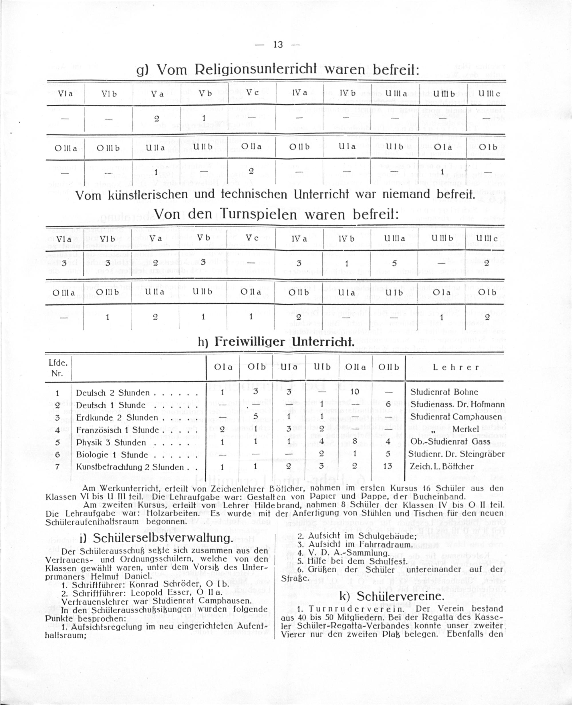 VI a VIb V a Vb Ve IV a IV b Ulll a Ullb Ulllc 3 3 2 3— 3 1 5— 2 OIl a Olllb Ull a Ullb O Il a OIllb Ula Ulb Ola Olb — 1 2 1 1 2—— 1 2 1 h) Freiwilliger Unterricht. lüle Ola oOib ura ulb oOna V OHllb Lehrer 1 Deuisch 2 Stunden...... 1 V 3 3 Z 10 V— Studienrat Bohne 2 Deutsch 1 Stunde......— u 1— 6 Studienass. Dr. Hofmann 3 Erdkunde 2 Slunden.....— 3 1 1—— Studienrat Camphausen 4 Französisch 1 Stunde...... 2 1 3 2——„ Merkel 5 Physik 3 Stunden..... 1 1 1 4 8 V 4 Ob.-Sfudienrat Cass 6 Biologie 1 Stunde......——,— 2 1 53 Studienr. Dr. Steingräber 7 Kunstbetrachtung 2 Stunden.. 1 V 1 V 2 3 2 13 Veich. L. Böffcher