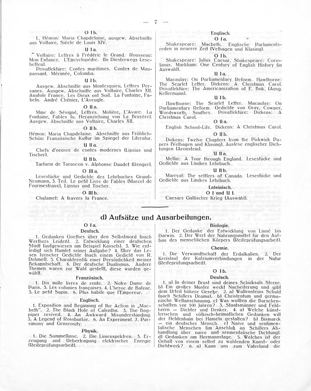 1. Cedanken Goethes über den Selbstmord(nach Werthers Leiden). 2. Entwicklung einer deutschen Stadt(aufgewiesen am Beispiel Kassels). 3. Wie ent- ledigt sich Hamlet seiner Aufgabe? 4. Uber das Le- sen lyrischer Gedichte(nach einem Gedicht von R. Dehmel). 5. Charakteristik einer Persönlichkeit meiner Bekanntschaft. 6. Der deutsche Dualismus. Andere Themen waren zur Wahl gestellt, diese wurden ge- wählt.
