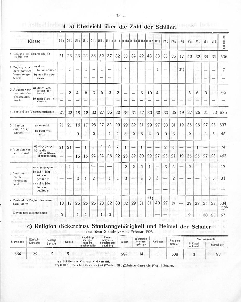 c) Religion(Bekenntnis), Staatsangehörigkeit und Heimat der Schüler nach dem Stande vom 1. Februar 1923.