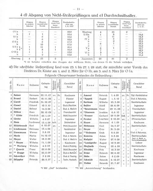 4f) Die schriftliche Reifeprüfung fand vom 23. 1. bis 27. 1. 28 statt, die mündliche unter Vorsitz des DireRtors Dr. Küster am 1. und 2. März für O Ib, am 3. und 5. März für O la. Folgende Oberprimaner bestanden die Reifeprüfung: