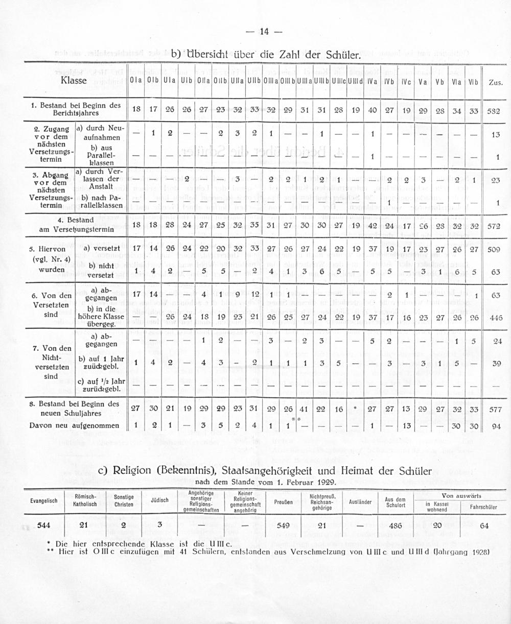 Klasse OlaOlb UIa UIbONla OMIbUlla UIIbOMaOIIbUIHa UIIbUMHeſUIIIdſWVa IVb WVo Va Vb Va VWbZas. 1. Bestand bei Beginn des. Berichtsjahres 18 17 26 26 27 23 32 33 32 29 31 31 28 19 40 27 19 20 28 34 33 582 2. Zugang ſa) durch Neu- vDrdem aufnahmen 1 ˙2 2 31 2 1 1— 1--- 13 nächsten Versetzungs- rb) Aus.-——— L=Dehe- 1--———— 1 termin hlassen a) durch Ver- ², AbFang lassen derſ—- 2 3— 2 2 1 2 1-—= 21 2 1 ³3— 2 1 2⸗ nächsten Anstalt Versetzunss- b) nac arpro..[ † 1 1 termin rallelhlassen* v“ 4. Pestancl 18 18 28 24 27 25 32 35 31 27 30 30 27 19 42 24 26 28 32 2 am Versetzungstermin 17 26 28 32 52 572 5. Hiervon a) versetzt 17 14 26 24 22 20 32 33 27 26 27 24 22 19 37 19 17 23 27 26 27 5009 (vgl. Nr. 4) b) nicht d———— wurden Versetgt 1 4 2 5 5 2 4 1 3 6 5 5 5 3 1 6 5 63 a) ab- 6. Von den dNaben 17 14—— 4 1 9 12 1 1————— 2 1——— 1 63 Versetzten b) in die sind höhere Klasse—— 26 24 18 19 23 21 26 25 27 24 22 19 37 17 16 23 27 26 26 446 übergeg. a) ab- ———-— 12-- 3— 2 ⁄[3—— IS2—-- 11 53 24 7. Von den Lesangen Nicht- b) auf 1 Jahr versete ſen zuückgebl. 1 4 2— 4 3— 2 1 1 1 3˙˙5—— 3— 3 1 5— 39 zud c) auf ½ ljahyuJ„I„ n4„.„„— zurückgebl. 8. Bestand bei Beginn des 30 21 19 29 29 25 31 20 26 41 22 16 ,27 27 15 29 27 32 35 577 neuen Schuljahres„ ⸗6 Davon neu aufgenommen 1 2 1— 3 5 2 4 1 1———— 1— 13—— 30 30 94 c) Religion(Behenntnis), Staatsangehörigheit und Heimat der Schüler nach dem Stande vom 1. Februar 1929. 4 Angehrige ſ ſeeſneh—— Von 5 . Römisch- Sonstige adi sonsti Religions- Nlichtpreuß. Aus 6 on auswärts 1 Evangelisch f 4 Jüdisch nstiger elig preuß Reichisan- Ausländ us dem. natelen hrte—— 544 21 2 3— V— V 549 b 21— 486 V 20 b 64