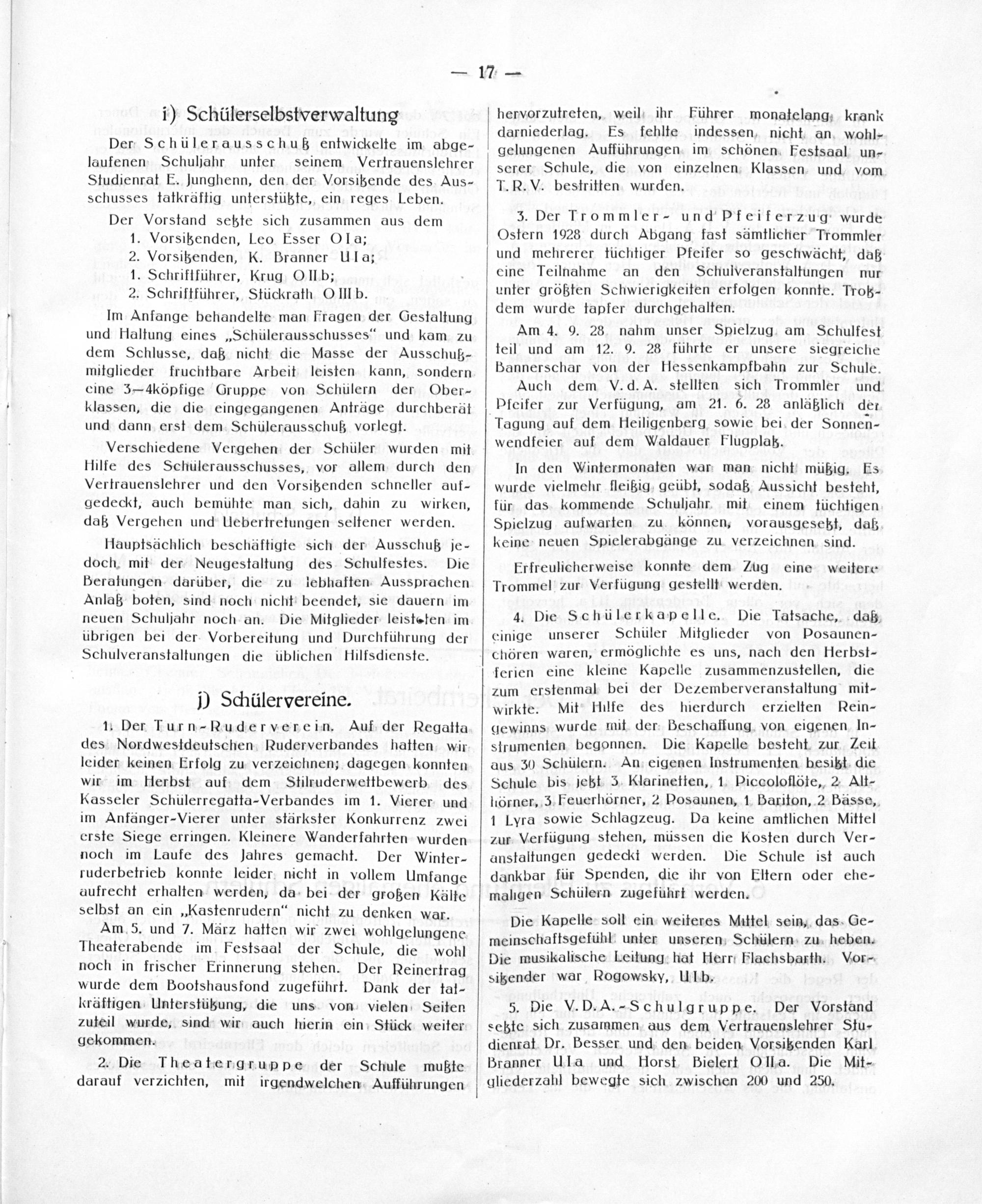 3. Der Trommler- und Pfeiferzug wurde Ostern 1928 durch Abgang fast sämtlicher Trommler und mehrerer tfüchtiger Pfeifer so geschwächt, daß eine Teilnahme an den Schulveranstaltungen nur unter größten Schwierigkeiten erfolgen konnte. Troß- dem wurde fapfer durchgehalten.
