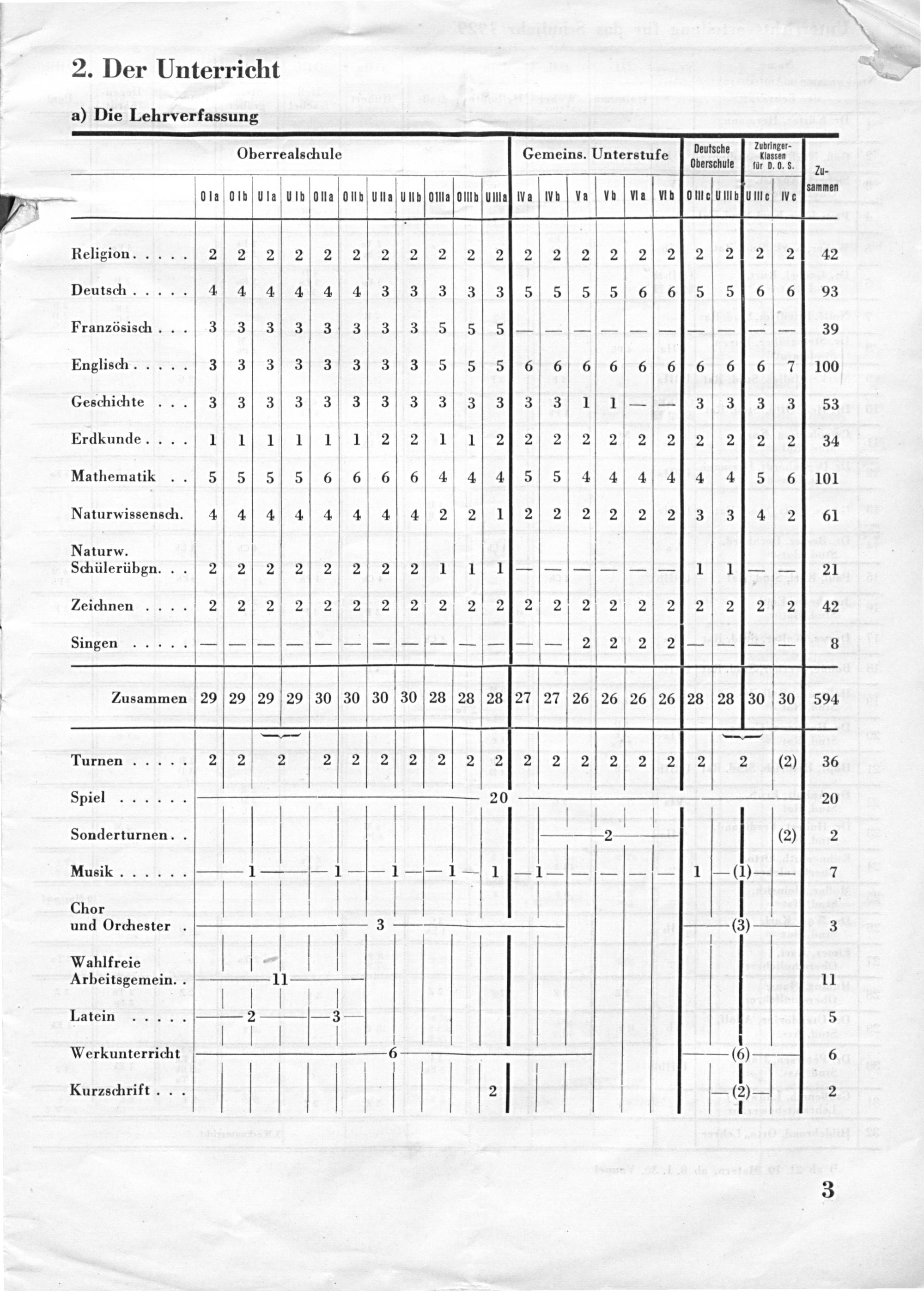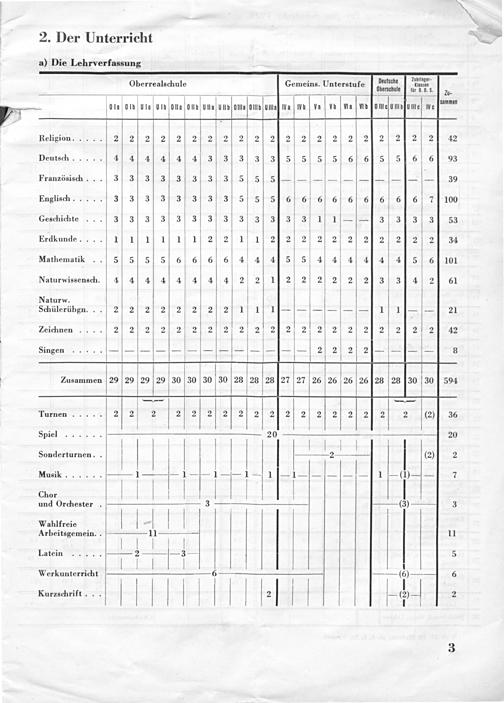 Oberrealschule Gemeins. Unterstufe benehule] mineen, 4 . sammen P 1n en UIa UIbOlla OHbUHaUHboma oOlnbumaLWa WhſVaVATa omeſunbfune We Religion..... 2 2 2 2 2 2 2 2 2⁰ 2 2 2 2 2 2 2 2 2 2 2 2 42 Deutsch..... 4 4 4 4 4 4 3 3 3 3 3 5 5 5°5 6 6 5 5.6 6 93 Französish 3 3 3 3 3 3 3 3 5 5 52————=-—=— 39 Englisch..... 31 3 3 3[3 3 3 3 5 5 5 6 6 6 6 6 6 6 6 6 7 100 Geschichte.. 3 3 3 3 3 3 3 3 3 3 3 3 3 1 1—— 3 3 3 3 53 Erdkunde.... 1 1 1 1 1 12 2 1 1 2 2 2 2 2 2 2 2 2 2 2 34 Mathematik.. 5 5 5 5 6 6 6 6 4 4 4 5 5 4 4 4 44 4[5 6] 101 Naturwissensch. 4 4 4 4 4 4 4 4 2 2 1I 2 2 2 2 2 2 3 3 4 2]61 ar. Schülerübgn.. 2 2 2 2 2 2 2 2 1 1 1-—————— 1 1——I 21 Zeichnen 2 2 2 2 2 2 2 2 2 2 2 2 2 2 2 2 2 2 2 2 2 42 Singen.....—-——-—-=-- Z=e— 2 2 2 2—= 3 V Zusammen 29 20 29 290 30 30 30 30 28 28 23[27 27 26 26 26 26[28 28[30 30 594 ———— Turnen..... 2 2 2 2 2 2 2 2 2 2 2 2 2 2 2 2 2 2(2) 36 Spiel...... 20 20 Sonderturnen. 2—(2) 2 Musik...... 1 1— 1—— 1— 1— 1———— 1—(1—— 7 Chor und Orchester. 3 6) 3 Wahlfreie Arbeitsgemein.. 11 11 Latein..... 1— 5 Werkunterricht 6(6) 6 Kurzschrift... b I b V 2 4- 2
