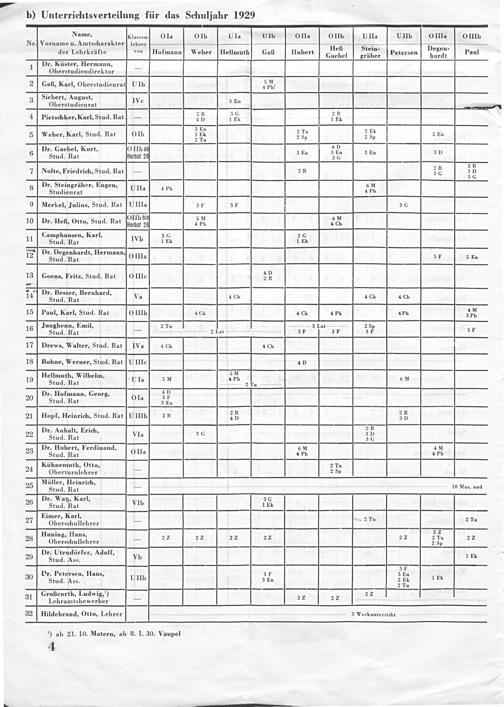 Name, Klassen- O Ia OIb UIa UIb OIIa OIIb UIIa UIIb OIIIa OIIIb Nr. Vorname u. Amtscharakter] lehrer IIs Ster— 5 der Lehrkräfte von Hofmann Weber(Hellmuth Gaß Hubert Caebel Sahan Petersen hesen⸗ Paul 1 Dr. Küster, Hermann, Oberstudiendirektor— 2 Caß, Karl, Oberstudienrat UIb 5 n. 3 Siebert, August, IVe 3 En Oberstudienrat—— 4 Pietschker, Karl, Stud. Ratt— 7 6 1 2 3 En 5 Weber, Karl, Stud. Rat OIb 154 2 dn 2 5 Ea Dr. Gaebel, Kurt 0 IIb ab 4% ** 3 En En D 6 Stud. Rat lerbst 29 2* 3 G 3 15 4 2 R 2 R 7 Nolte, Friedrich, Stud. Ratf— 2 R 3 G 3 5 Dr. Steingräber, Eugen, 3 6 M 8 Studienrat UIl⸗ 4 P 4 Ph 9 Merkel, Julius, Stud. Rat UIIIa 3 F 3 F 3 G OIIb bi 5 M 6 M 10 Dr. Heß, Otto, Stud. Rat erst 29 4 ph 4 Ch Camphausen, Karl, 3 G 3 G 11 SZiudl Rat Ivb ir 1 E 15*Dr. Degenhardt, Hermann, 3 12 Stud. Rat OIIIa 5 F 5 En . 4 D 13] CGoens, Fritz, Stud. Rat OIIIe 2 R 71“ Dr. Besser, Bernhard, 14 Stud. Rat Va 4 Ch 4 Ch 4 Ch 15 Paul, Karl, Stud. Rat OIIIb 4 Ch 4 C4 4 Ph 4Ph 7 Junghenn, Emil, 2 Tla— 3 Lateteneerewee 25 16 Ane. Rat unn— 2 Lat.. 3 F 2 3 F 3* 5 F 17] Drews, Walter, Stud. Rat IVa 4 Ch 4 Ch 18 Bohne, Werner, Stud. Rat UIIIc 4 D Hellmuth, Wilhelm,. 5 19 Stud. Rat UIa 5 1. 14. 2 Tu—. 4 ℳ Dr. Hofmann, Georg, 4 D 20 Stud. Rat o 21 Hopf, Heinrich, Stud. Rat UIIIb 2R 25 2 R Dr. Anhalt, Erich, 1 22² Stud. Rat VIa 26 3 5 Dr. Hubert, Ferdinand, 6 M 4 M 23 Stud. Rat 2 OIla 4 Ph 4 Ph 24 Kühnemuth, Otto, 2 Tu Oberturnlehrer— 2 Sp Möller, Heinriicichchchhheeeeeee,‧‧‧,‧‧,,,,..... 25 Itud. Rat. 10 Mas. und Dr. Watz, Karl, 3 C 26 ud. Rat VIb 1 EL Eimer, Karl, 2 27 Oberschullehrer 2r 2 ru Huning, Hans, 2 2½ 28 Oberschullehrer— 22 2² 22½ 22½ 2 2 89 22 Dr. Utendörfer, Adolf, 29 Stud. Ass. Vb 1 Ek Dr. P H 1, r. Petersen ans, 3 F 3 En 30 Stud. Ass. 3 UIIb 3 En 2 Fb 1 E Großcurth, Ludwig,¹) 22 31 Lehra itsbewerbet— 2 2 22 ² 32 Hildebrand, Otto, Lehrereeee=PVlſSwveerrrrreeeee 3 Werkunterrichtreeeeeeeee e