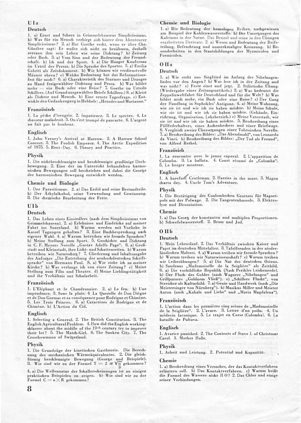 1. a) Die Bedeutung der homologen Reihen, nachgewiesen am Beispiel der Kohlenwasserstoffe. b) Die Umsetzungen des Kalciums in der Natur. Das Benzol und seine in den Übungen erarbeiteten Derivate. 2. a) Wesen und Bedeutung der Reife- teilung, Befruchtung und unmerkmaligen Kreuzung. b) Be- sonderheiten in den Staatsbildungen der Myrmiciden und Formiciden.