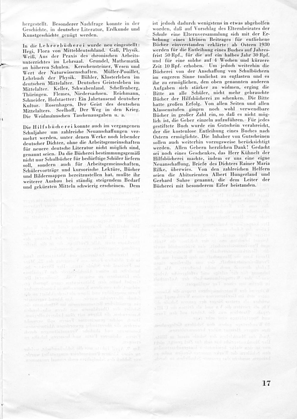 ist jedoch dadurch wenigstens in etwas abgeholfen worden, daß auf Vorschlag des Elternbeirates der Schule eine Elternversammlung sich mit der Er- hebung eines kleinen Beitrages für entliehene Bücher einverstanden erklärte: ab Ostern 1930 werden für die Entleihung eines Buches auf Jahres- frist 50 Rpf., für die auf ein halbes Jahr 30 Rpf. und für eine solche auf 4 Wochen und kürzere Zeit 10 Rpf. erhoben. Um jedoch weiterhin die Bücherei von der Anschaffung von Schulbüchern im engeren Sinne tunlichst zu entlasten und es ihr zu ermöglichen, den oben genannten anderen Aufgaben sich stärker zu widmen, erging die Bitte an alle Schüler, nicht mehr gebrauchte Bücher der Hilfsbücherei zu schenken. Die Bitte hatte großen Erfolg. Von allen Seiten und allen Klassenstufen gingen noch wohl verwendbare Bücher in großer Zahl ein, so daß es nicht mög- lich ist, die Geber einzeln aufzuführen. Für jedes gestiftete Buch wurde ein Gutschein verabreicht, der die kostenlose Entleihung eines Buches nach Ostern ermöglichte. Die Inhaber von Gutscheinen sollen auch weiterhin vorzugsweise berücksichtigt werden. Allen Gebern herzlichen Dank! Gedacht sei noch eines Geschenkes, das Herr Kühnelt der Hilfsbücherei machte, indem er uns eine eigne Neuanschaffung, Briefe des Dichters Rainer Maria Rilke, überwies. Von den zahlreichen Helfern seien die Abiturienten Albert Hungerland und Gerhard Suhre genannt, die dem Leiter der Bücherei mit besonderem Eifer beistanden.