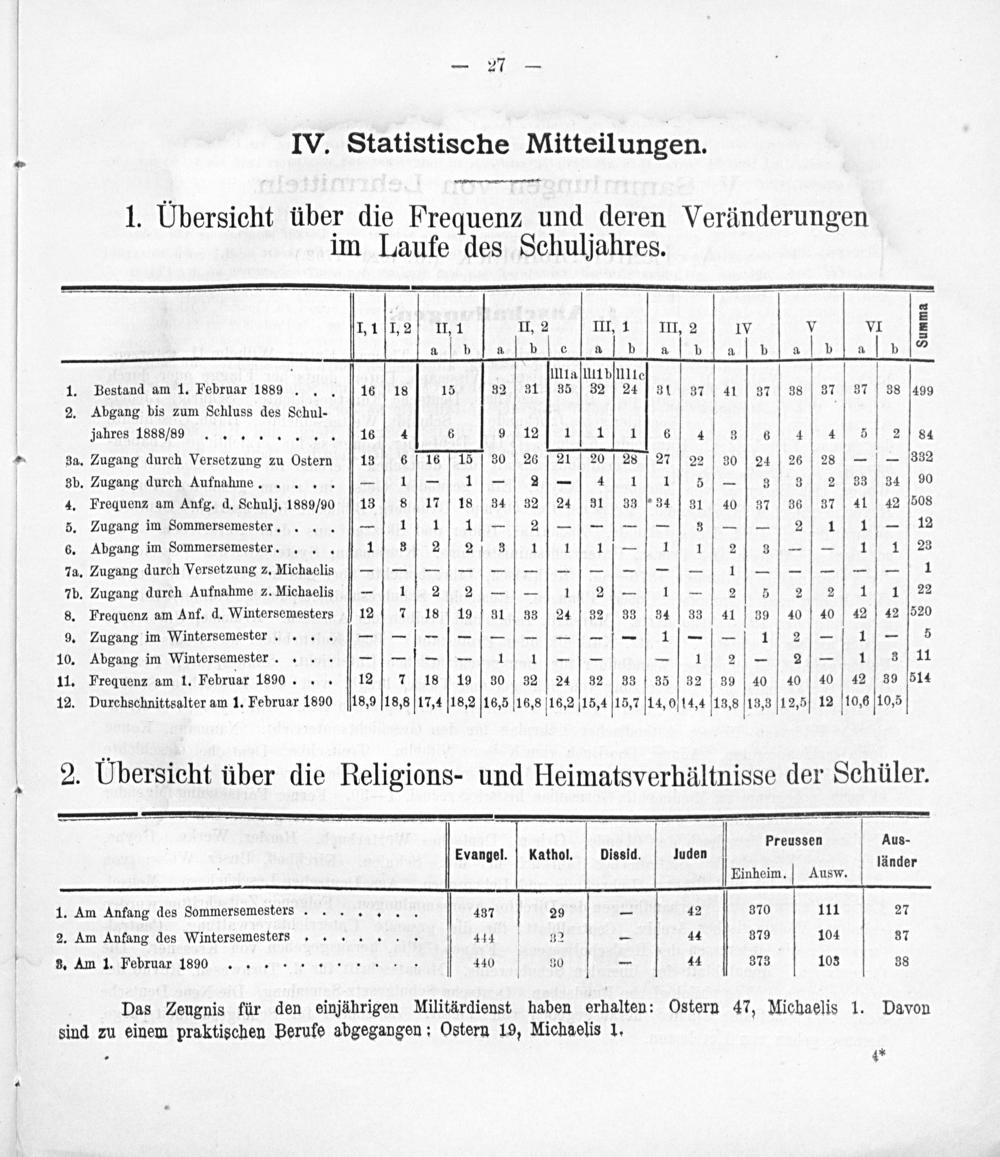 ——————; Preussen Aus- Evangel. Kathol. Dissid. Juden Hander Einheim. Ausw. 1. Am Anfang des Sommersemesters. 1 437 29— 42 370 111 27 2. Am Anfang des Wintersemesters... 414 32— 44 379 10⁰4 37 8. Am 1. Februar 1890...... 440 30— 44 373 103 38 Das Zeugnis für den einjährigen Militärdienst haben erhalten: Ostern 47, Michaelis 1. Davon