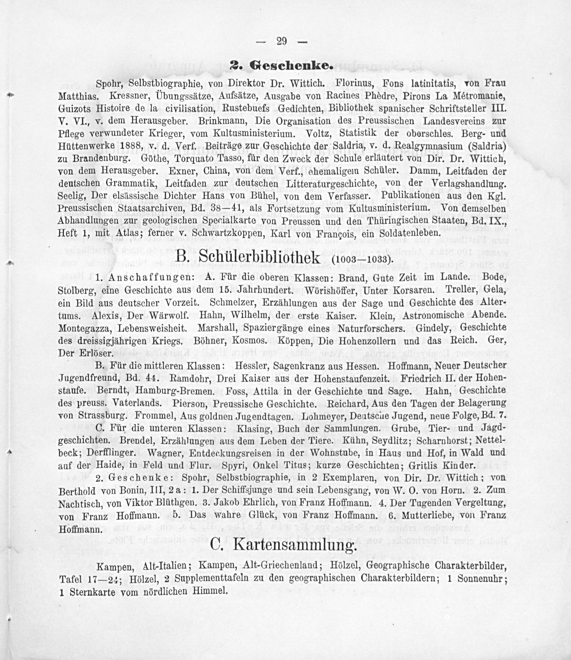 Spohr, Selbstbiographie, von Direktor Dr. Wittich. Florinus, Fons latinitatis, von Frau Matthias. Kressner, Ubungssätze, Aufsätze, Ausgabe von Racines Phèdre, Pirons La Métromanie, Guizots Histoire de la civilisation, Rustebuefs Gedichten, Bibliothek spanischer Schriftsteller III. V. VI., v. dem Herausgeber. Brinkmann, Die Organisation des Preussischen Landesvereins zur Pflege verwundeter Krieger, vom Kultusministerium. Voltz, Statistik der oberschles. Berg- und Hüttenwerke 1888, v. d. Verf. Beiträge zur Geschichte der Saldria, v. d. Realgymnasium(Saldria) zu Brandenburg. Göthe, Torquato Tasso, für den Zweck der Schule erläutert von Dir. Dr. Wittich, von dem Herausgeber. Exner, China, von dem Verf., ehemaligem Schüler. Damm, Leitfaden der deutschen Grammatik, Leitfaden zur deutschen Litteraturgeschichte, von der Verlagshandlung. Seelig, Der elsässische Dichter Hans von Bühel, von dem Verfasser. Publikationen aus den Kgl. Preussischen Staatsarchiven, Bd. 38— 41, als Fortsetzung vom Kultusministerium. Von demselben Abhandlungen zur geologischen Specialkarte von Preussen und den Thüringischen Staaten, Bd. IX., Heft 1, mit Atlas; ferner v. Schwartzkoppen, Karl von François, ein Soldatenleben.
