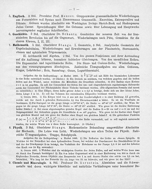 8. Physik. 3 Std. Oberlehrer Stange. Mathematische Behandlung ausgewählter Abschnitte der Mechanik. Die Lehre vom Licht. Wiederholungen aus allen Teilen der Physik. Zahl- reiche Ucungsaufgaben. Trappe, Schulphysik.