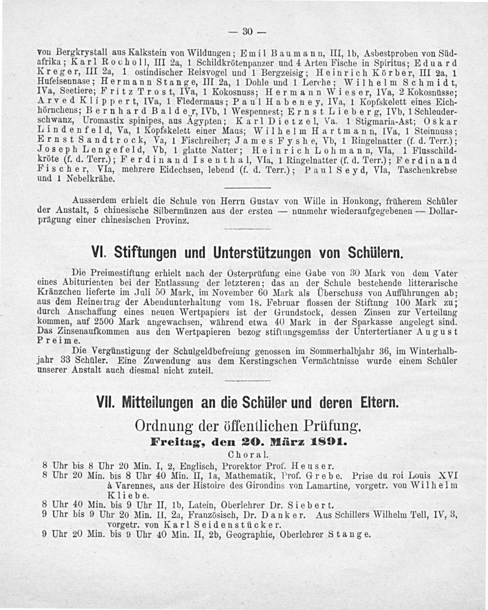 Ordnung der öffentlichen Prüfung. Freitag, den 20. März 1891. Choral. 8 Uhr bis 8 Uhr 20 Min. I, 2, Englisch, Prorektor Prof. Heuser. 8 Uhr 20 Min. bis 8 Uhr 40 Min. II, 1a, Mathematik, P'rof. Grebe. Prise du roi Louis XVI à Varennes, aus der Histoire des Girondins von Lamartine, vorgetr. von Wilhelm Kliebe. 8 Uhr 40 Min. bis 9 Uhr II, 1b, Latein, Oberlehrer Dr. Siebert. 9 Uhr bis 9 Uhr 20 Min. II, 2a, Französisch, Dr. Danker. Aus Schillers Wilhelm Tell, IV, 3, vorgetr. von Karl Seidenstücker. 9 Uhr 20 Min. bis 9 Uhr 40 Min. II, 2b, Geographie, Oberlehrer Stange.