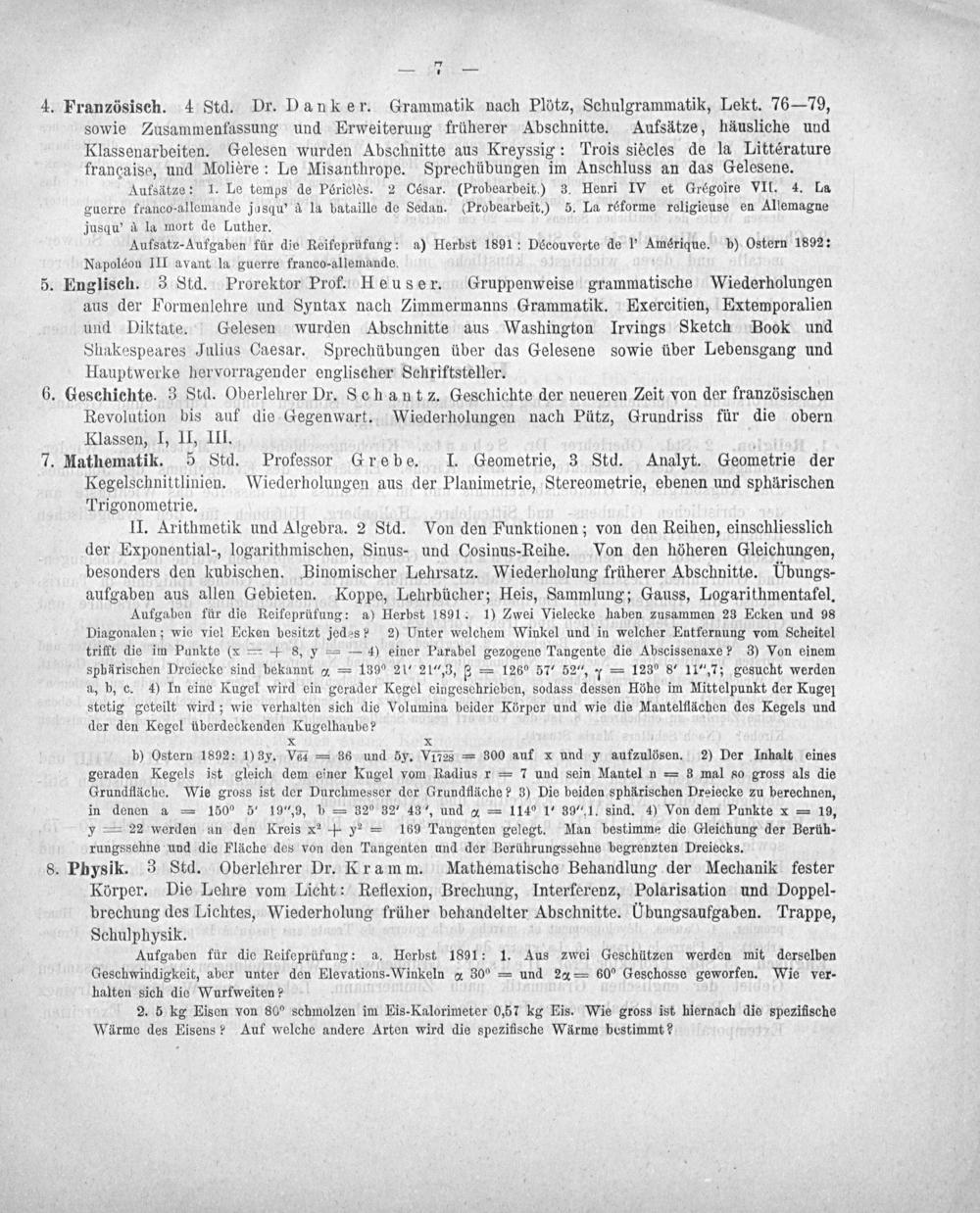 7. Mathematik. 5 Std. Professor Grebe. I. Geometrie, 3 Std. Analyt. Geometrie der