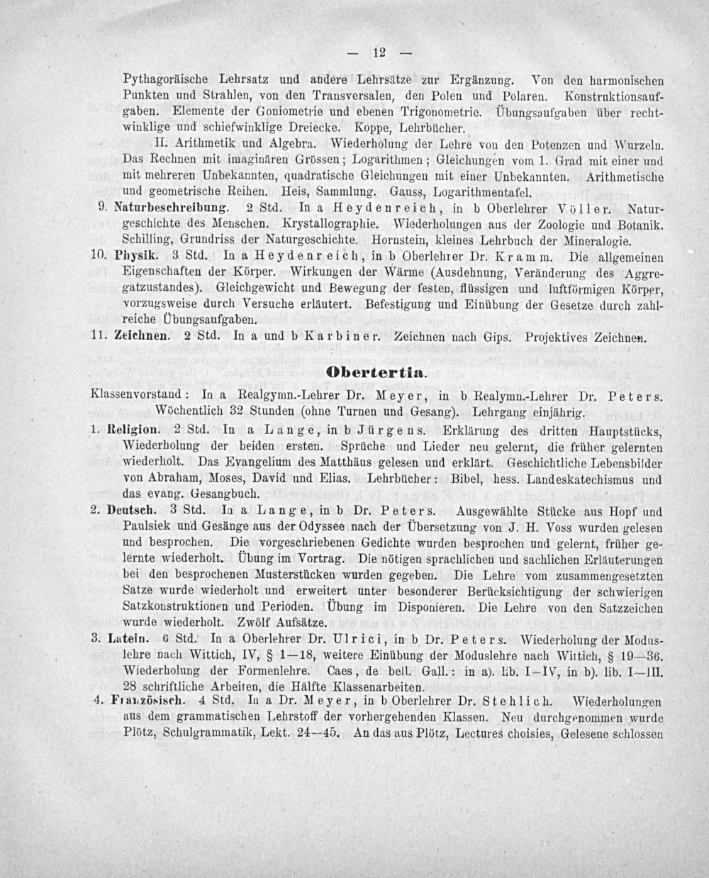 Pythagoräische Lehrsatz und andere Lehrsätze zur Ergänzung. Von den harmonischen Punkten und Strahlen, von den Transversalen, den Polen und Polaren. Konstruktionsauf- gaben. Elemente der Goniometrie und ebenen Trigonometrie. Übungsaufgaben über recht- winklige und schiefwinklige Dreiecke. Koppe, Lehrbücher.