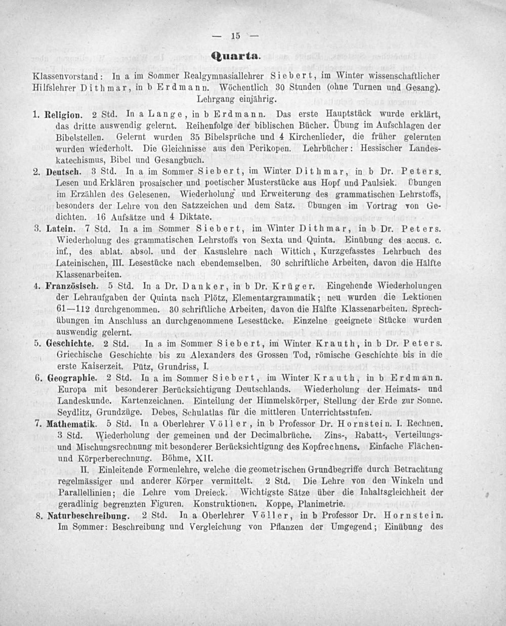 3. Latein. 7 Std. In a im Sommer Siebert, im Winter Dithmar, in b Dr. Peters. Wiederholung des grammatischen Lehrstoffs von Sexta und Quinta. Einübung des accus. c. inf., des ablat. absol. und der Kasuslehre nach Wittich, Kurzgefasstes Lehrbuch des Lateinischen, III. Lesestücke nach ebendemselben. 30 schriftliche Arbeiten, davon die Hälfte Klassenarbeiten.