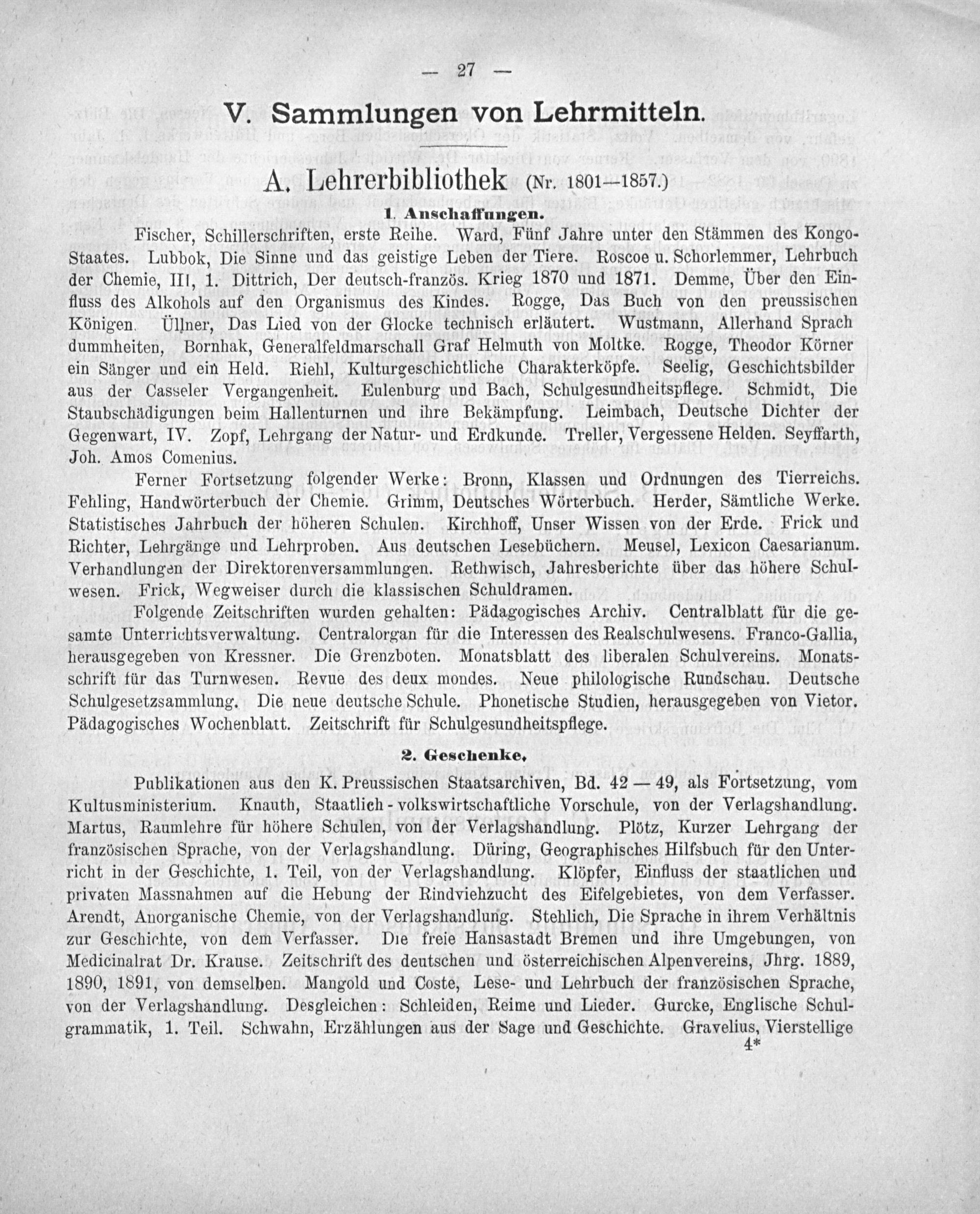 Ferner Fortsetzung folgender Werke: Bronn, Klassen und Ordnungen des Tierreichs. Fehling, Handwörterbuch der Chemie. Grimm, Deutsches Wörterbuch. Herder, Sämtliche Werke. Statistisches Jahrbuch der höheren Schulen. Kirchhoff, Unser Wissen von der Erde. Frick und Richter, Lehrgünge und Lehrproben. Aus deutschen Lesebüchern. Meusel, Lexicon Caesarianum. Verhandlungen der Direktorenversammlungen. Rethwisch, Jahresberichte über das höhere Schul- wesen. Frick, Wegweiser durch die klassischen Schuldramen.